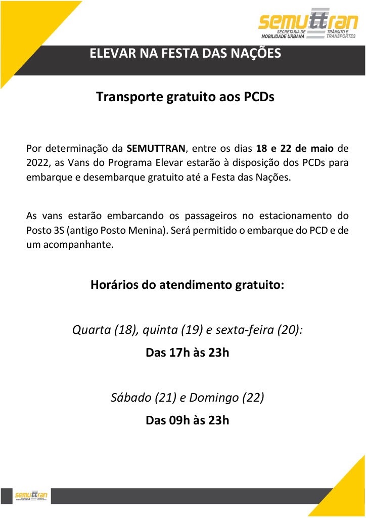 PCDs – As pessoas com deficiência (PCDs) que queiram prestigiar a Festa das Nações também serão beneficiadas com veículos do Elevar, da Prefeitura de Piracicaba. Os veículos farão embarque gratuito de pessoas com deficiência, em área no estacionamento do posto de combustíveis 3S (avenida Presidente Kennedy). Elas poderão embarcar com um acompanhante. Hoje, quarta-feira, 18/05, quinta-feira, 19/05, e sexta-feira, 20/05, as vans do Elevar fazem o transporte das 17h às 23h. No sábado, 21/05, e domingo, 22/05, das 9h às 23h.