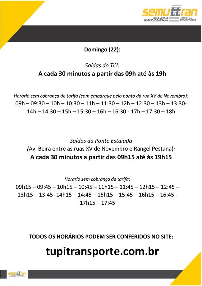 RETORNO – A Prefeitura também disponibilizará a linha para o retorno até o TCI, com saída da avenida Beira Rio, no ponto entre as ruas XV de Novembro e Rangel Pestano. Também com intervalo de 30 minutos entre as viagens.