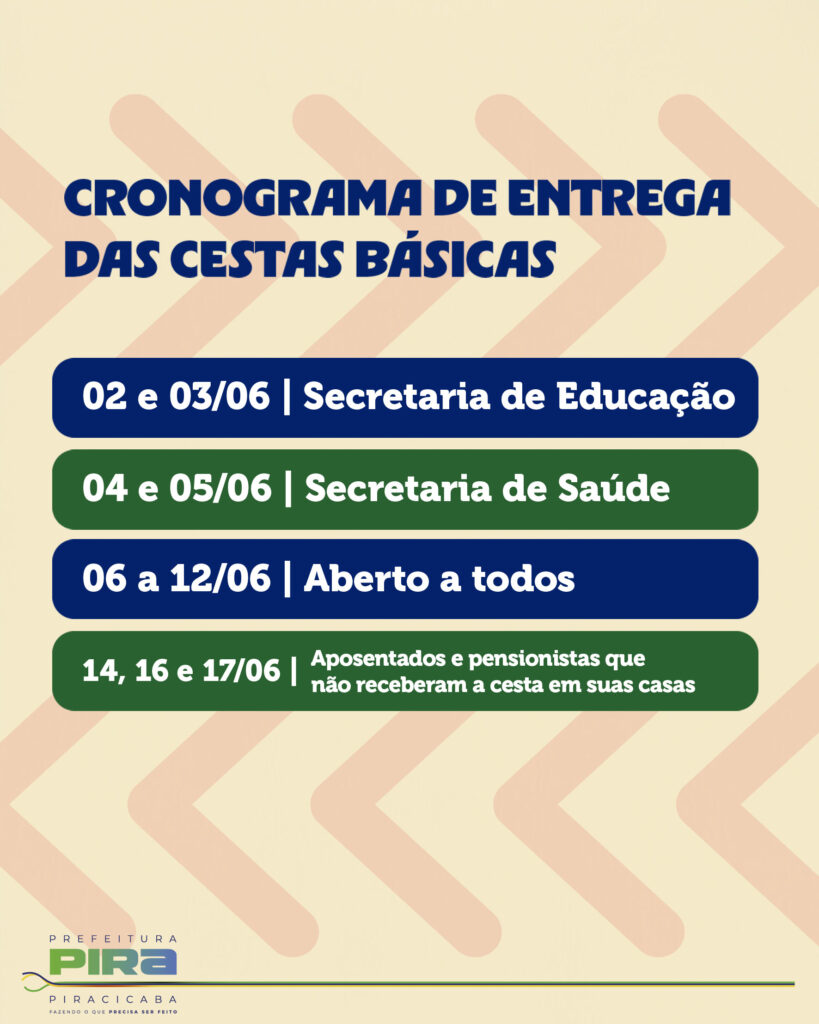 A Prefeitura, por meio da Secretaria Municipal de Administração e Governo, definiu o calendário de entrega das cestas básicas aos servidores ativos no mês de junho. A entrega tem início dia 02/06 e segue até o dia 12/06, na avenida Dr. Paulo de Moraes, 1.248, Bairro Paulista. Os dias e horários para a retirada são de segunda a sexta, das 8h às 18h, e aos sábados, das 8h às 12h.