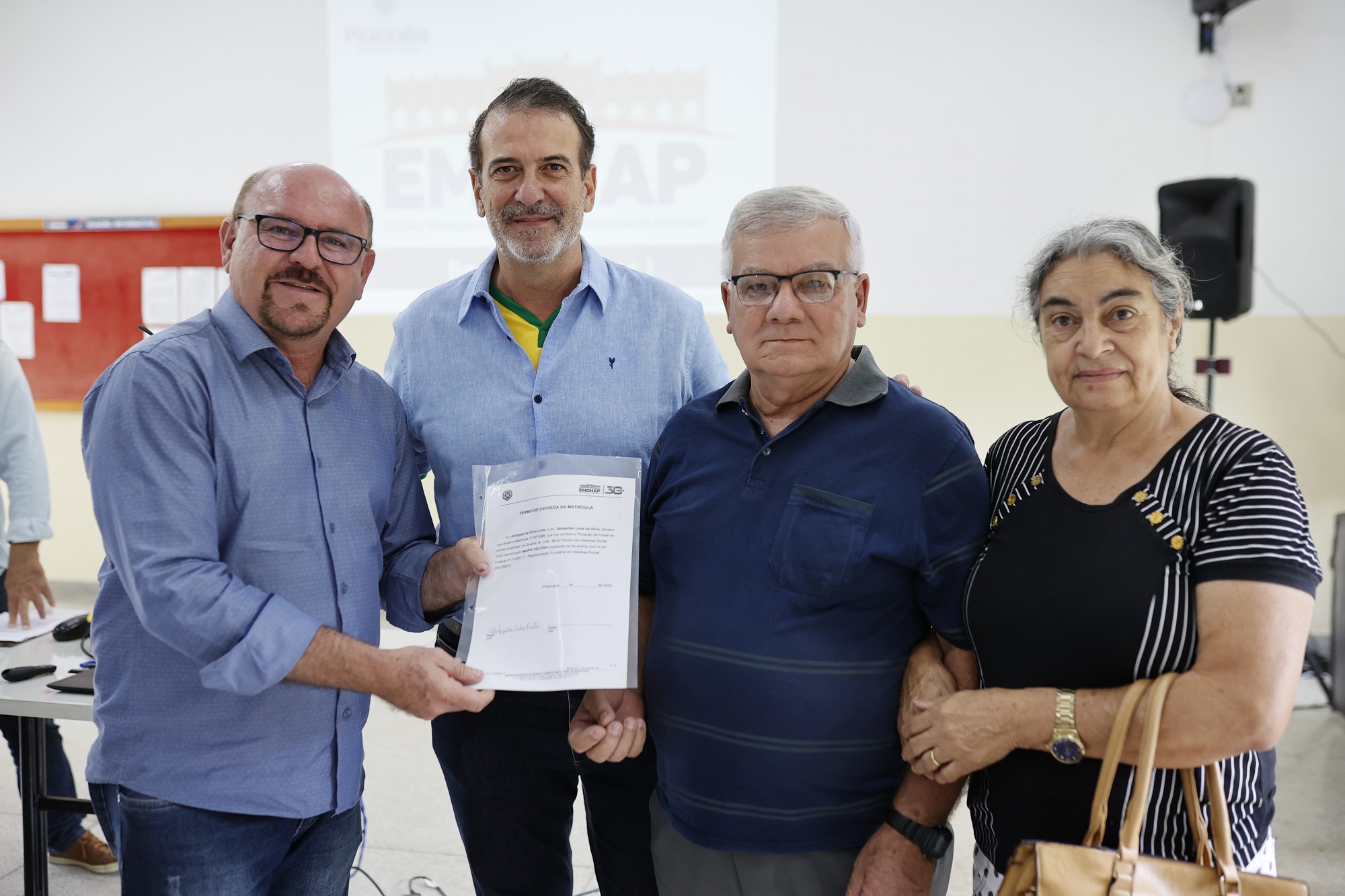 Casal Adalgiza e Sebastião Leite recebem documento pelas mãos do vereador Anilton Rissato e do prefeito Luciano Almeida