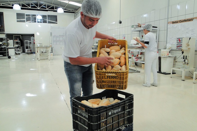 Antonio Ricardo da Luz Jr. ajudante de producao na Rivana Padaria & Delicatesen, mostra pães que sobraram