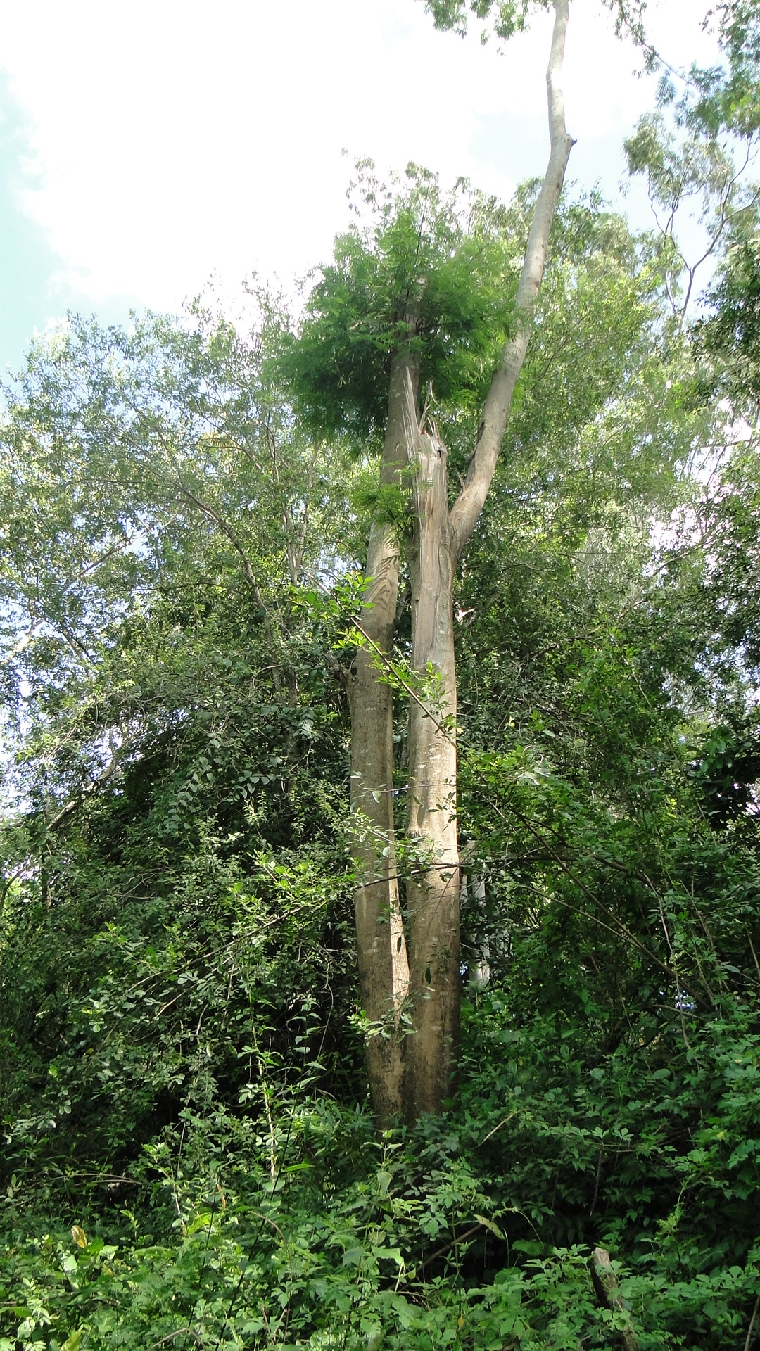 Farinha-seca danificada pelas chuvas e que oferece risco de queda; à direita, a leucena, espécie invasora