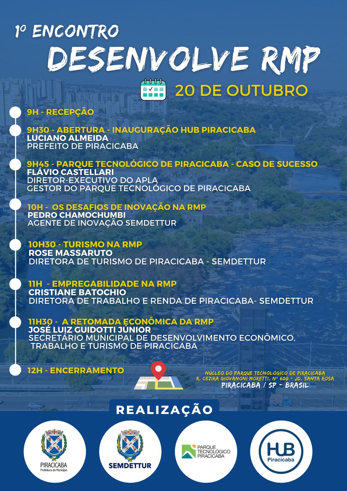 Empresas poderão contar com a assessoria do Hub por até 6 meses Na prática, o espaço físico do Hub Piracicaba funcionará como ponto de apoio para startups em estágio inicial, que poderão contar com mentoria e acesso gratuito a infraestrutura por até seis meses para vivenciar este ambiente de negócios já consolidado e reconhecido globalmente. Os programas previstos pelo Hub Piracicaba visam fomentar o desenvolvimento das vocações econômicas do município e responder as tendências de transformação digital em estratégicas verticais, como cidades inteligentes, gestão publica, indústria 4.0, manufatura avançada, turismo, energia, agronegócio e alimentos. Já estão disponíveis na plataforma digital do Hub Piracicaba os programas de aceleração de startups, o programa de capacitação (com bolsa integral) para formação de programadores e desenvolvedores de tecnologias, integração de agentes de inovação e o programas de inovação na indústria. Para conhecer os programas do HUB os interessados devem acessar www.hubpiracicaba.com DESENVOLVE RMP – A inauguração do Hub Piracicaba abrirá o 1º Encontro Desenvolve RMP, evento idealizado para integrar os agentes promotores de políticas públicas dedicadas ao Desenvolvimento Econômico, Trabalho e Renda, Turismo e Inovação na Região Metropolitana de Piracicaba. Após a inauguração do Hub Piracicaba, Flávio Castellari, diretor-executivo do Apla (Arranjo Produtivo Local do Álcool), dará palestra sobre o Parque Tecnológico, do qual é gestor. Na sequência, profissionais ligados à Semdettur abordarão temas pertinentes as suas respectivas áreas de atuação, com Pedro Chamochumbi falando sobre os Desafios da Inovação, Rose Massaruto sobre Turismo e Cristiane Batochio sobre Empregabilidade. O evento se encerra com o secretário José Luiz Guidotti Júnior que vai tratar sobre Retomada Econômica na RMP (confira a programação em anexo).