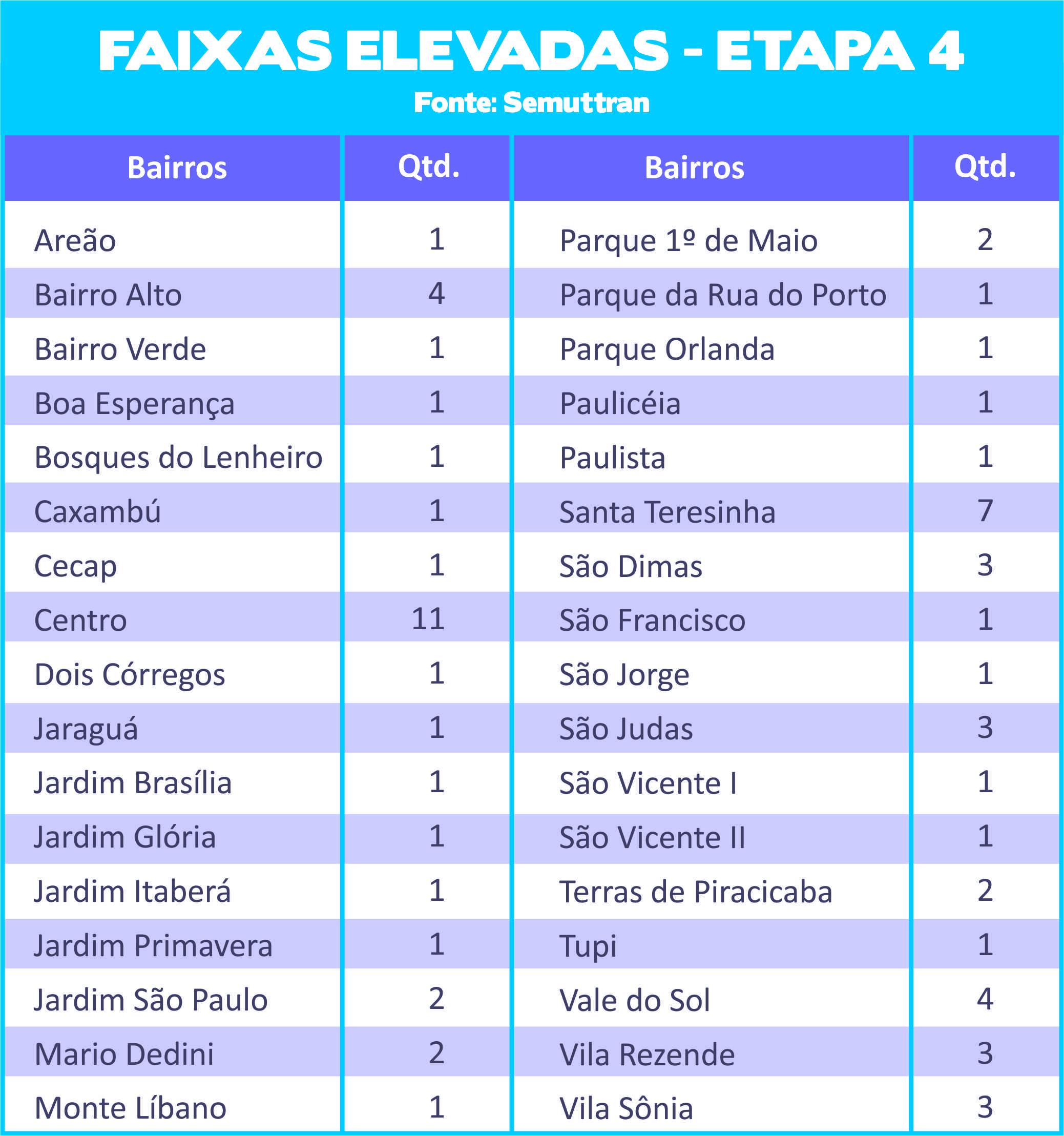 A Prefeitura de Piracicaba, por meio da Semuttran (Secretaria Municipal de Trânsito e Transportes), iniciou a instalação de mais 68 faixas elevadas em diversos bairros da cidade, em pontos considerados estratégicos, como em frente a escolas e outros locais com fluxo intenso de veículos e pedestres. Dos 68, 21 equipamentos já foram instalados.