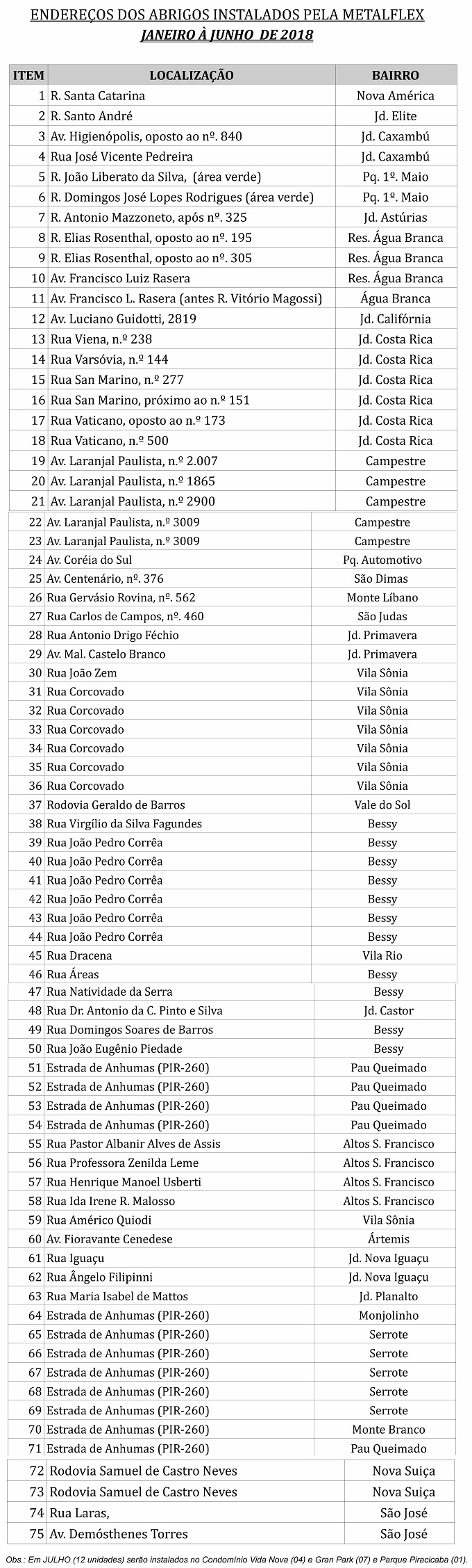 A Prefeitura de Piracicaba já instalou 75 novos abrigos de ônibus em ruas, avenidas, estradas e rodovia da cidade, de janeiro até junho. Os equipamentos, no total 300, foram adquiridos em contrato com a empresa Metalflex. O objetivo da Administração é oferecer mais conforto aos usuários do transporte coletivo das áreas urbana e rural.