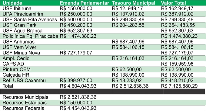 Do total dos aproximados R$ 7 milhões, R$ 2,5 milhões são recursos exclusivos do tesouro municipal e R$ 150 mil do governo estadual. A diferença (cerca de R$ 4,5 milhões) vem do Governo Federal, fruto de convênios entre a Prefeitura de Piracicaba e a Caixa Econômica Federal, sendo os recursos federais e estaduais resultados de articulações políticas e emendas parlamentares dos senadores José Serra e José Aníbal, deputados federais Vanderlei Macris, Airton Sandoval, Evandro Gussi e Antonio Carlos Mendes Thame, e deputado estadual Roberto Morais. A expectativa da Secretaria de Saúde é que todas as obras em andamento possam ser concluídas ainda no primeiro semestre do ano que vem.