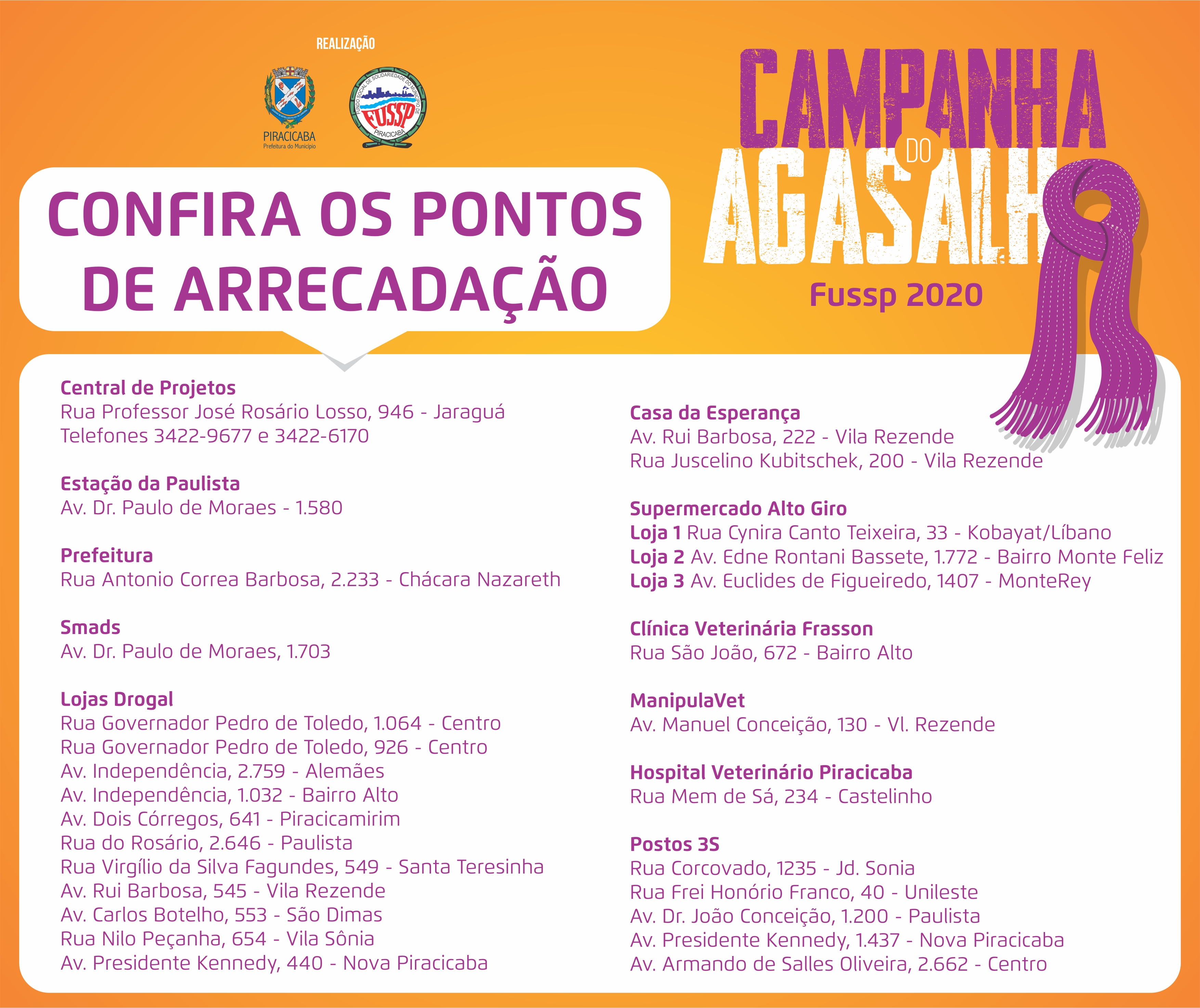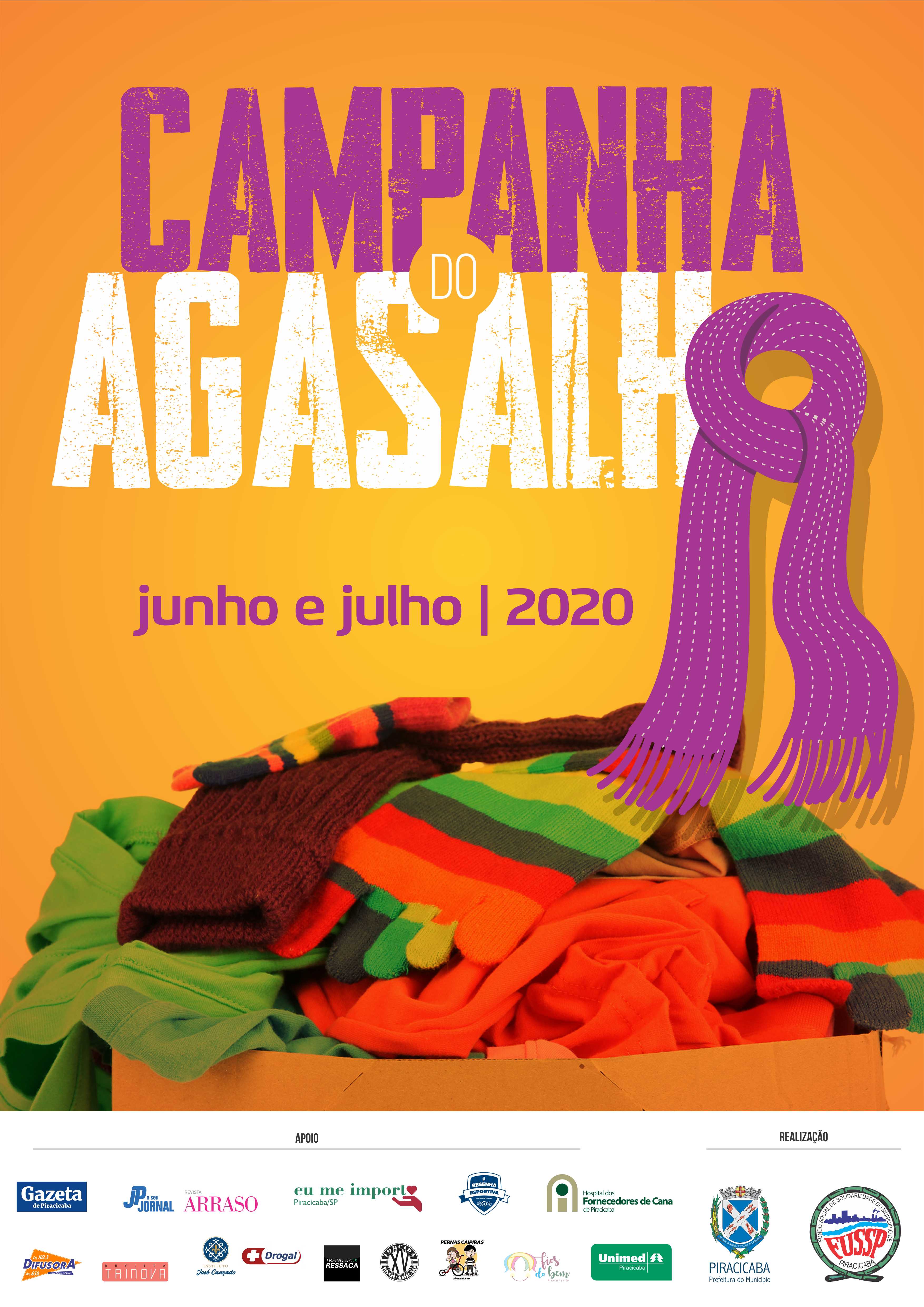 A Prefeitura, por meio do Fundo Social de Solidariedade de Piracicaba (Fussp), realiza a Campanha do Agasalho 2020, que acontecerá nos meses de junho e julho. O Fussp tem como parceiros a Gazeta de Piracicaba, Jornal de Piracicaba e Revista Arraso, Drogal, Instituto José Cançado, blog Resenha Esportiva, Rádio Difusora, Revista Trinova e os projetos sociais Pernas Caipiras, Fios do Bem, Eu Me Importo Piracicaba, Torcida Esquadrão, Treino da Ressaca e Amigos do Bem, da Unimed e Hospital dos Fornecedores de Cana (HFC).