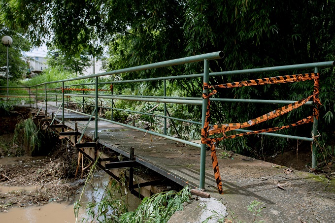 Passarela da avenida Francisco Abel Pereira está interditada com faixas da Defesa Civil, pois uma placa de cimento da passarela foi derrubada pela força das águas