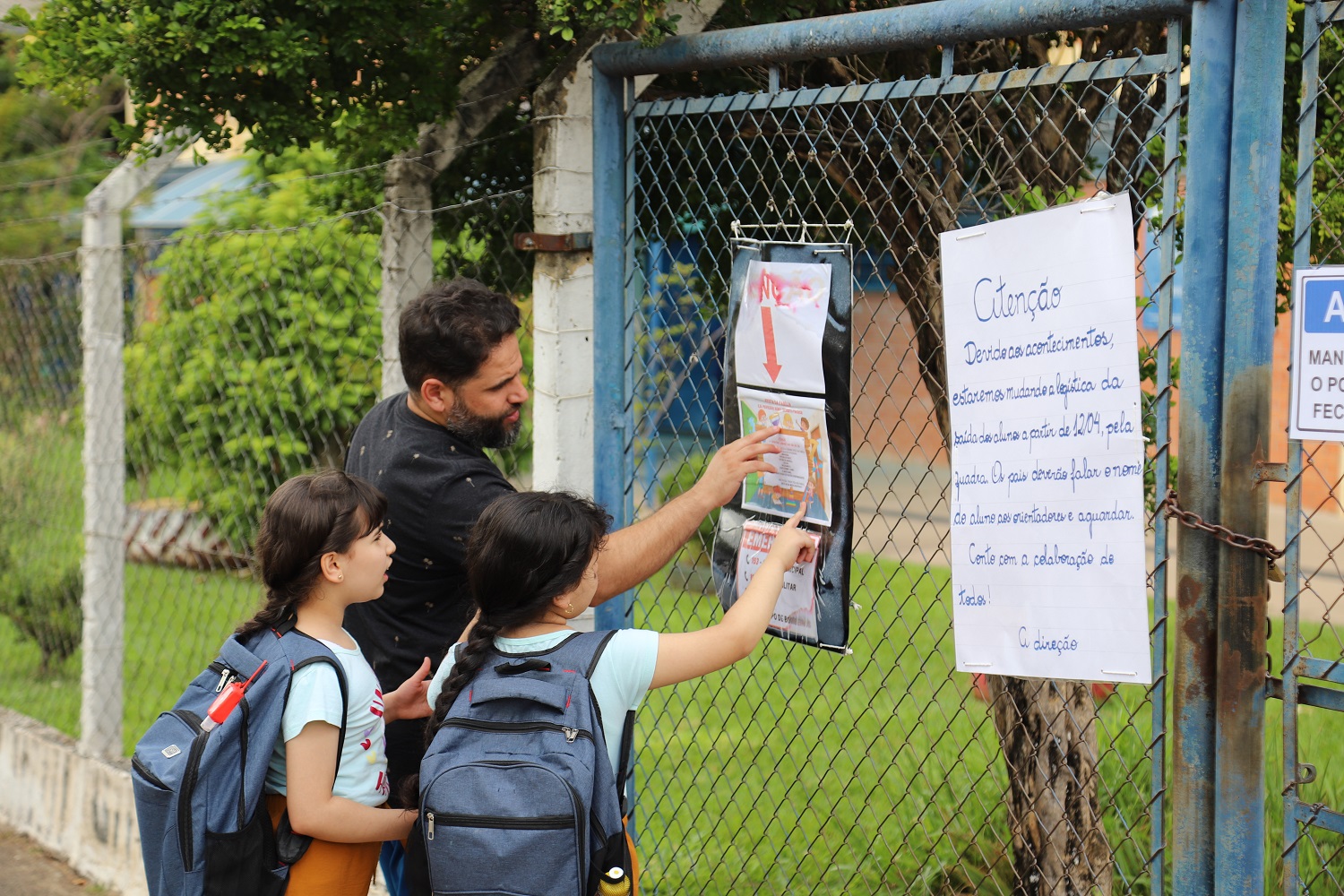 Pais e filhos leem orientações afixadas no alambrado de escola