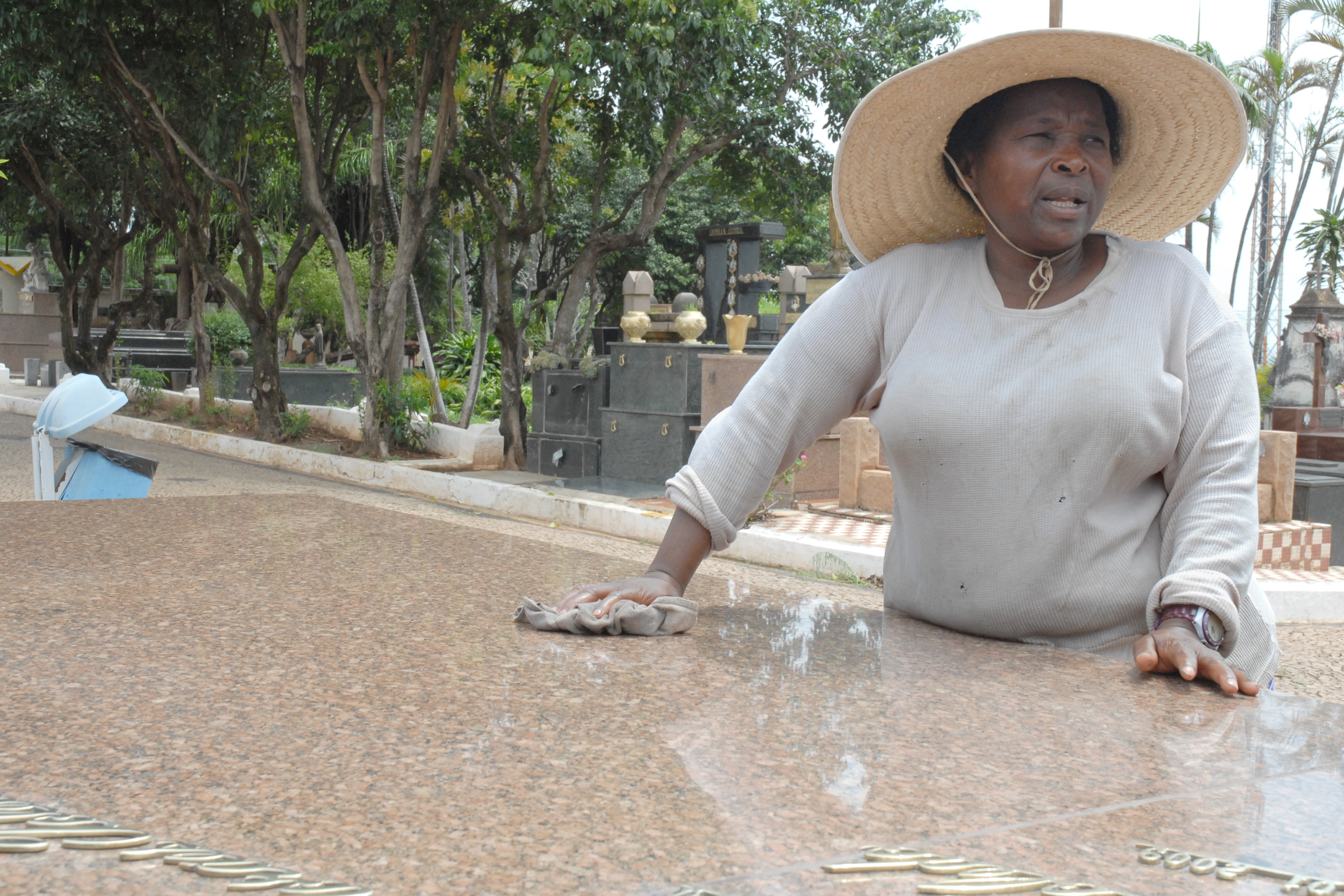 PREPARAÇÃO – A reportagem do Centro de Comunicação Social da Prefeitura esteve no Cemitério da Saudade na quarta-feira, 26, e conversou com Jandira Belardi que, acompanhada pelo filho José Antônio César Ferreira, limpava o túmulo de familiares para o Finados. No Saudade estão sepultados os restos mortais de um filho que morreu há 40 anos, com 20 dias, e do marido, falecido há 25 anos.