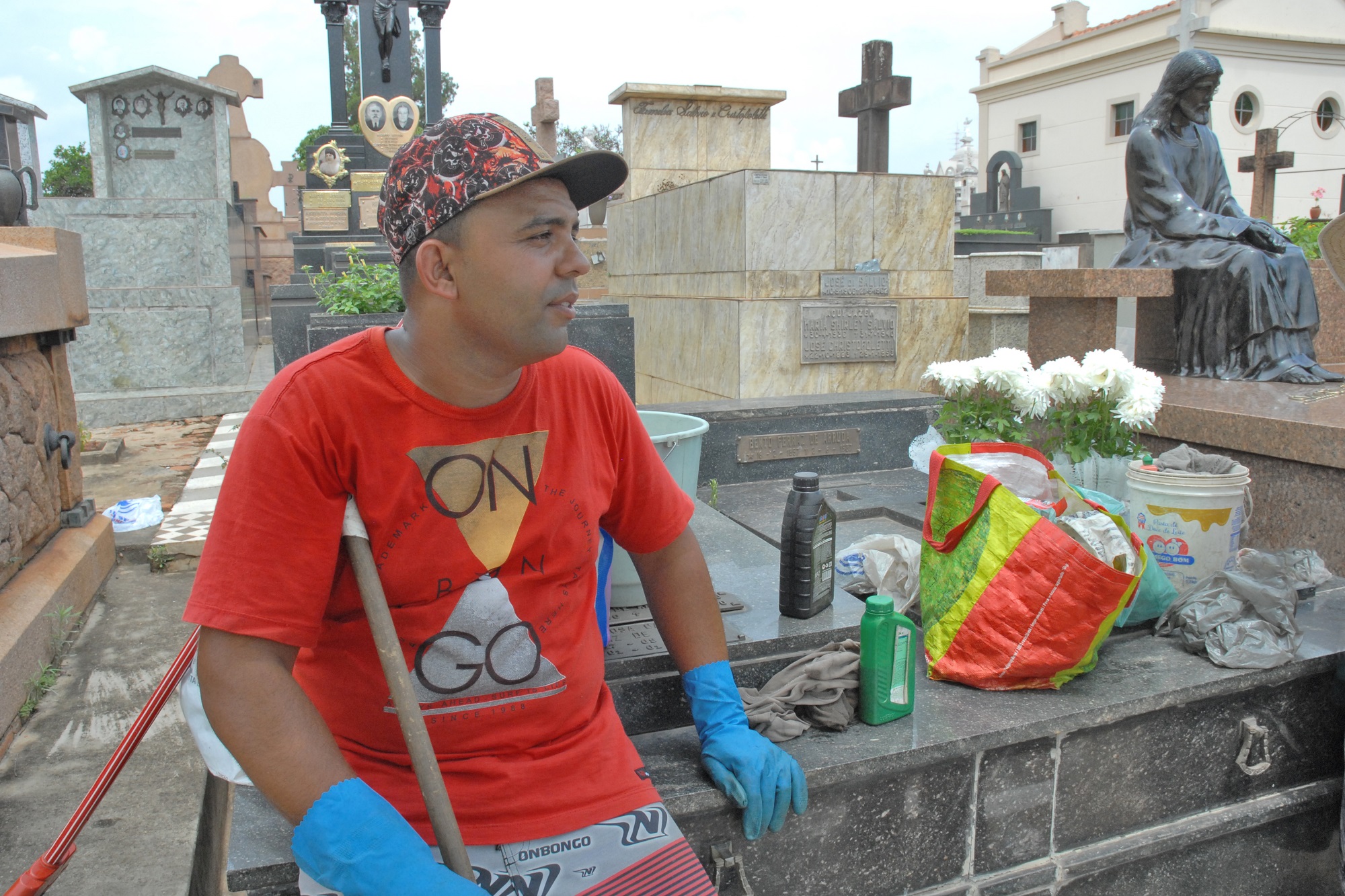 Thiago Estevam também trabalha no Saudade, na limpeza dos túmulos
