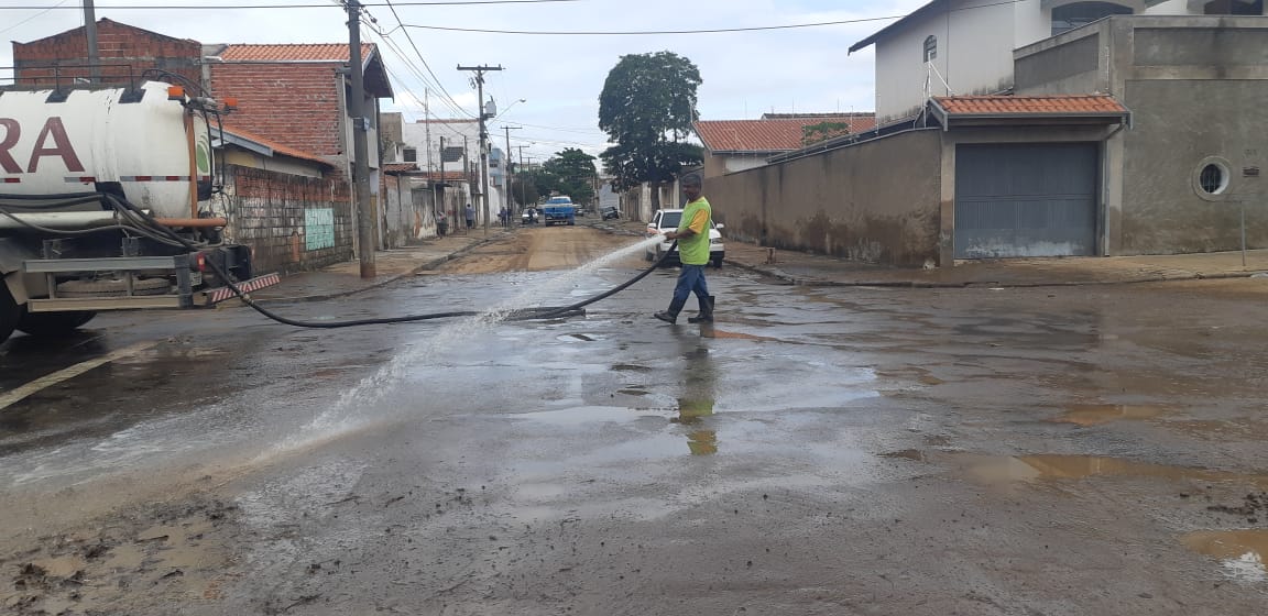 Equipes da Prefeitura realizaram serviços de limpeza e lavagem das ruas nas regiões localizadas próximas a rios e ribeirões que transbordaram nas chuvas de segunda-feira