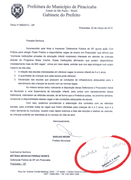 Como afirmado ontem ao tomar conhecimento do fato da Defensoria Pública ter ajuizado ação Civil Pública para obrigar Poder Público a disponibilizar vagas de ensino infantil em Piracicaba, o Procurador-geral do município, Dr. Milton Sérgio Bissoli, protocolou hoje, 22, ofício assinado pelo prefeito Barjas Negri, à Dra. Betânia Bevechi Ferraz Bonfá, Defensora Pública de SP em Piracicaba.
