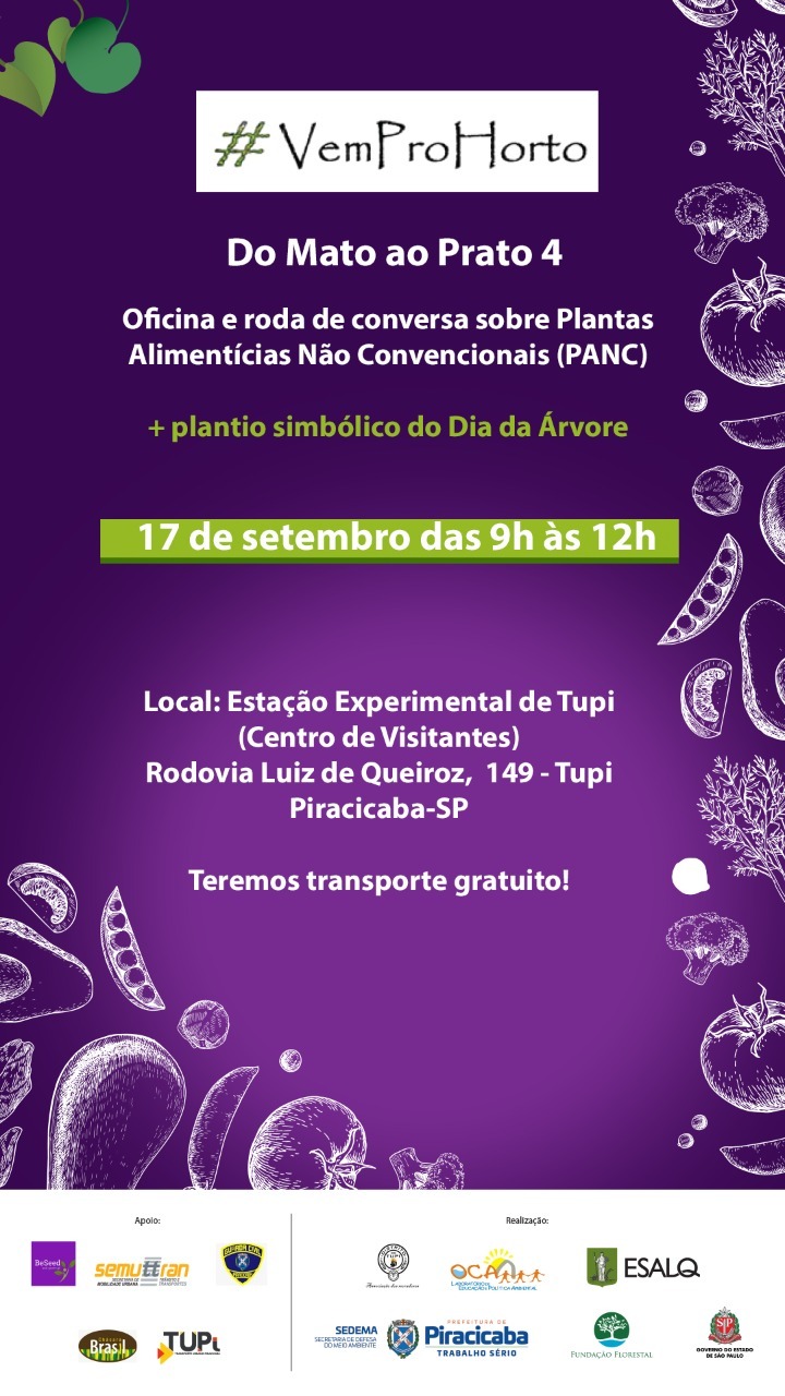 4ª edição do evento Do Mato ao Prato terá oficina e roda de conversa sobre as PANCs A Prefeitura de Piracicaba, por meio da Secretaria de Defesa do Meio Ambiente (Sedema), realiza no sábado, 17/09, a quarta edição do projeto Do Mato ao Prato, na Estação Experimental de Tupi (Horto de Tupi), das 9h às 12h. A ação é gratuita e aberta a toda a população. Será disponibilizado um ônibus, também de forma gratuita, para facilitar o acesso dos participantes ao Horto de Tupi (leia abaixo).