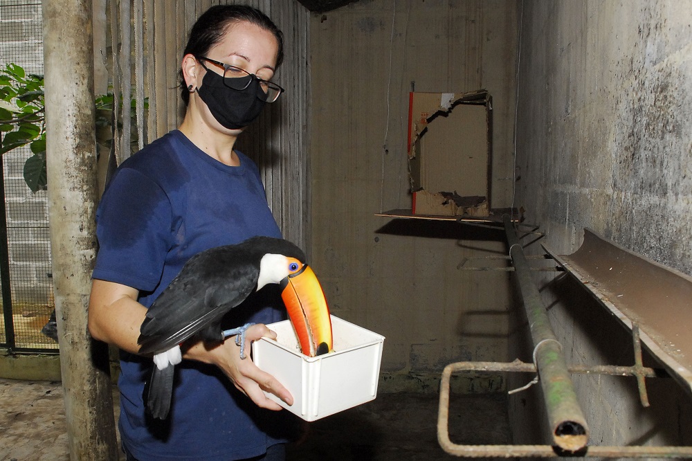 Analine Caetano é a tratadora que alimenta o tucano diariamente com muito carinho – Foto – Justino Lucente
