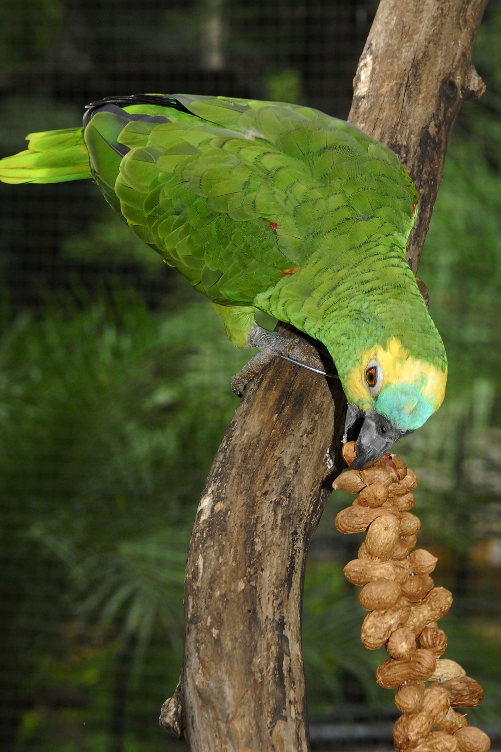 Papagaio é presenteado diariamente com colar de amendoins, uma das formas de enriquecimento ambiental – Foto – Justino Lucente