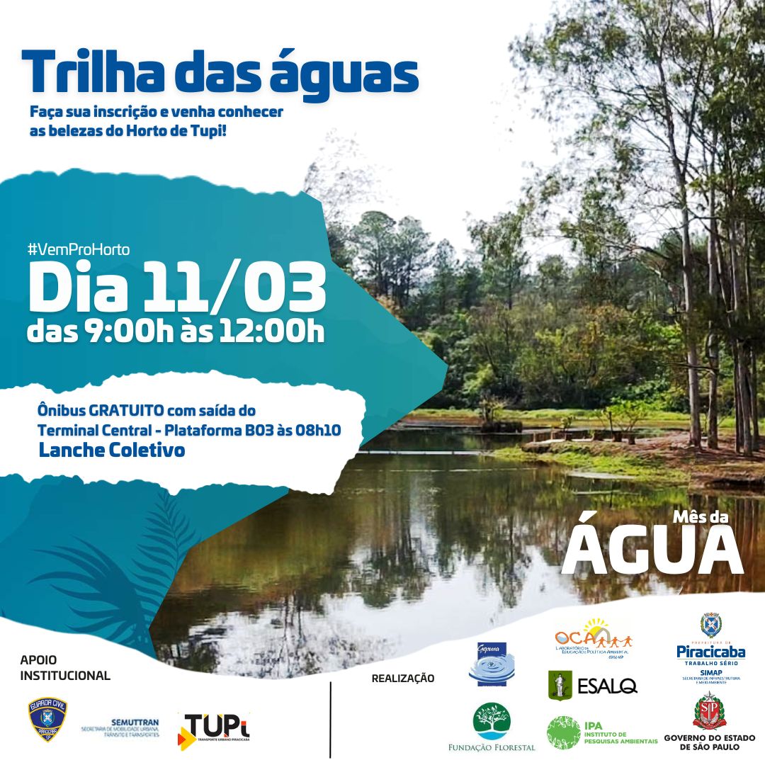 A Prefeitura, por meio da Secretaria de Infraestrutura e Meio Ambiente (Simap), em parceria com o Instituto de Pesquisas Ambientais (IPA), a Fundação Florestal (FF), o Laboratório de Educação e Política Ambiental (Oca/Esalq-USP) e o Grupo de Estudos e Práticas para o uso racional da Água (Gepura/Esalq-USP), realiza no sábado, 11/03, das 9h às 12h, a Trilha das Águas, no Horto de Tupi. A entrada é gratuita mediante inscrição prévia; são 40 vagas e as inscrições podem ser feitas pelo link: https://bit.ly/trilha-das-aguas .