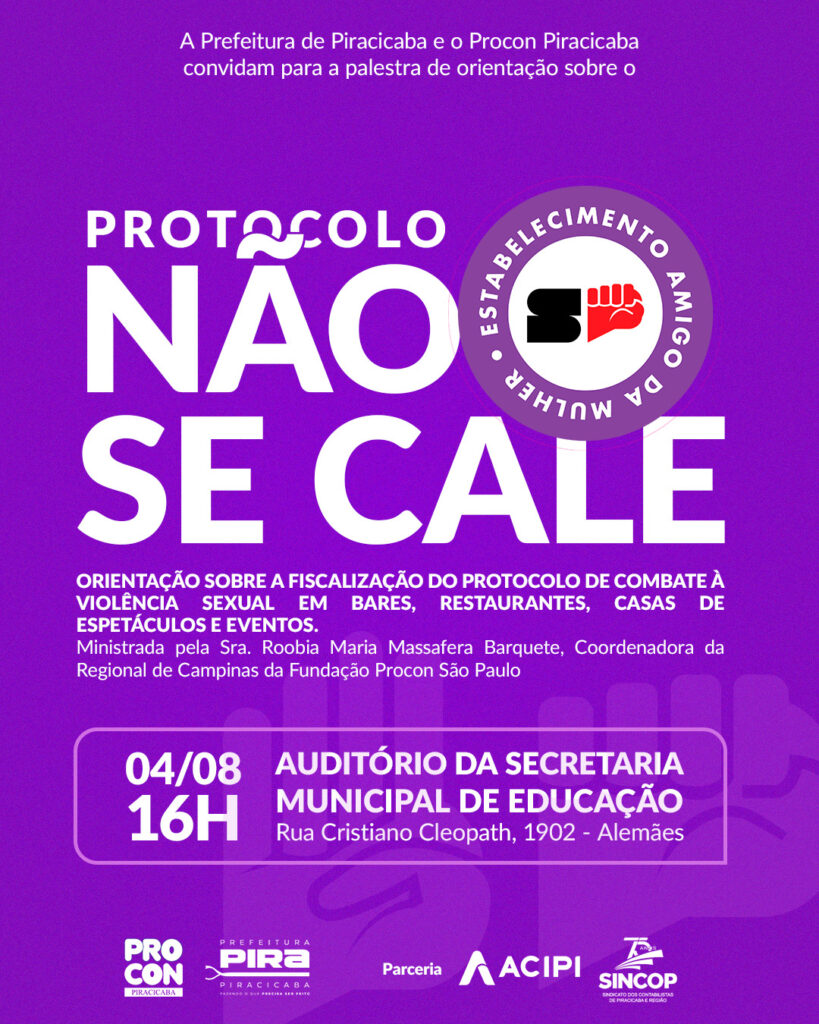A Prefeitura de Piracicaba, por meio do Procon Municipal e em parceria com a Acipi (Associação Comercial e Industrial de Piracicaba) e o Sincop (Sindicato dos Contabilistas de Piracicaba e Região), realiza na próxima segunda-feira, 04/08, às 16h, uma palestra de orientação sobre o protocolo Não se Cale, que estabelece medidas de combate à violência sexual contra mulheres em bares, restaurantes, casas de espetáculos, eventos e outros espaços de lazer. A ação será realizada no auditório da Secretaria de Educação, localizado na rua Cristiano Cleopath, 1902 – Alemães.