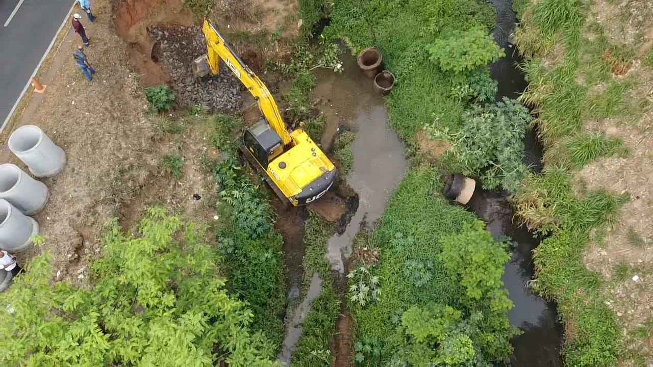 A obra começou com a limpeza do local e a execução da base em rachão, espécie de pedra. Na sequência serão assentados cerca de seis metros de tubos de 1 metro de diâmetro e refeito o aterro.