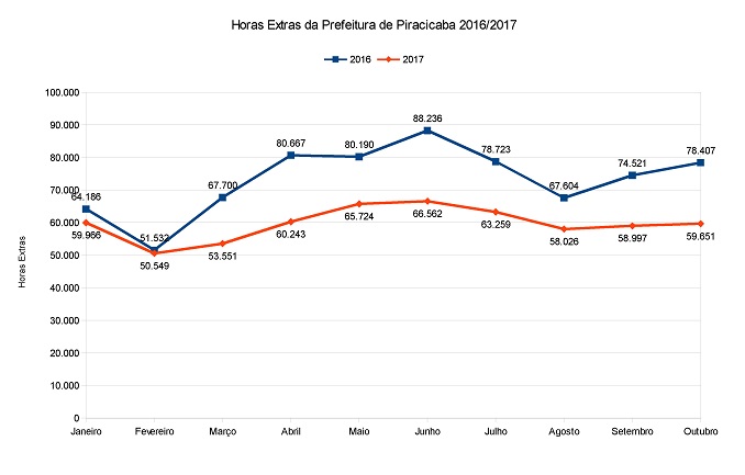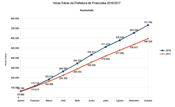 De janeiro a outubro deste ano, a Prefeitura de Piracicaba reduziu o número de horas extras de 731.766, registradas no mesmo período de 2016, para 596.528 mil em 2017. São 135.238 horas a menos, o que equivale a uma redução de 18,4%. A informação é da Secretaria Municipal de Administração. Em valores, a redução significou uma economia de R$ 2.909.332,00 se comparado ao mesmo período de 2016.