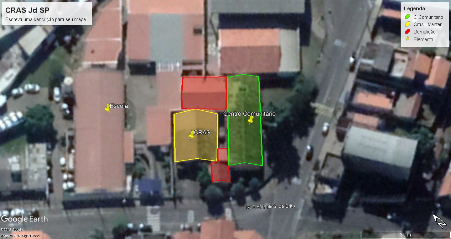 Foto de satélite que mostra a área do Cras atual (amarelo e vermelho) e também do Centro comunitário (verde) Após a reforma o prédio será composto apenas pela parte amarela.