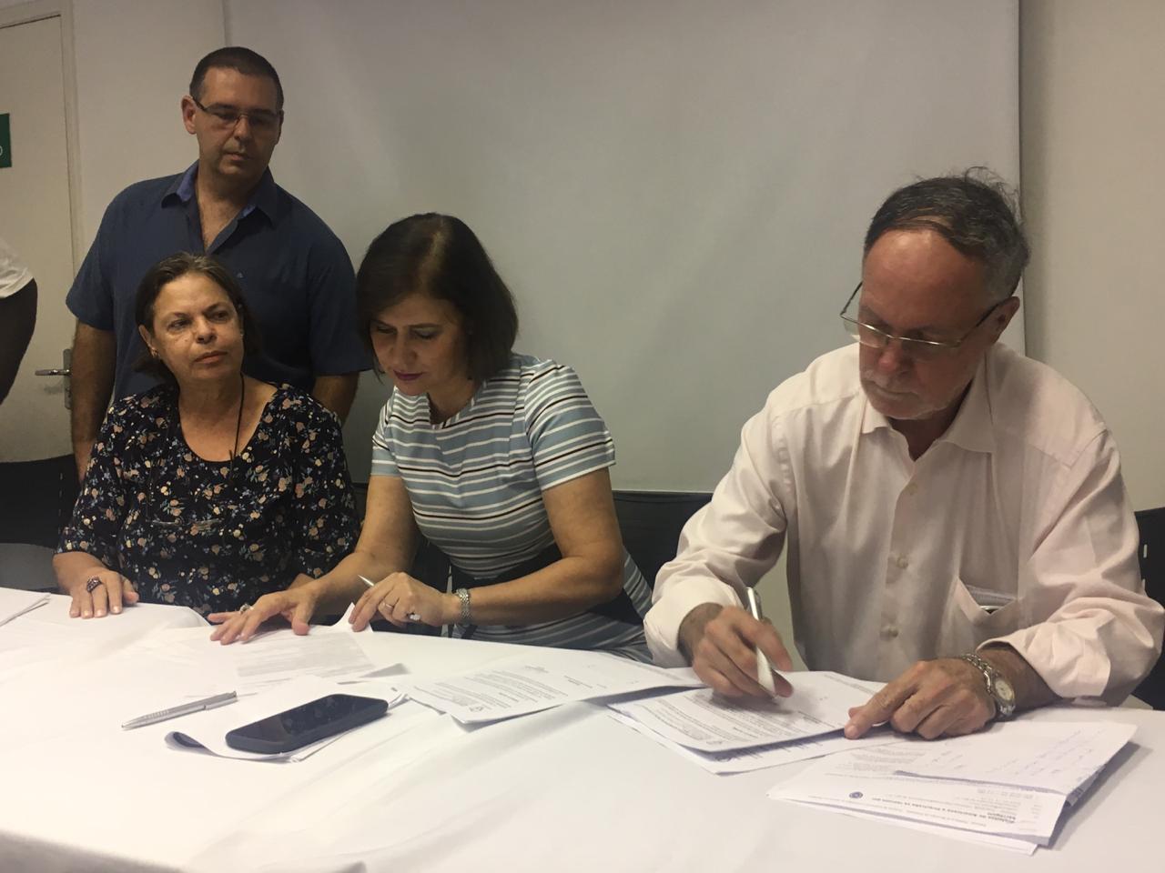 Célia Regina Mazero Prestes, presidente da Apae, Eliete Nunes, titular da Smads e o Prefeito Barjas Negri assinando a parceria, sendo observados pelo presidente do CMDCA Roger Nascimento.