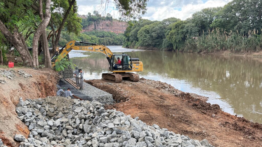 As obras para estabilização da margem do rio estão sendo executadas em trechos específicos, assim como a construção de novas saídas de águas pluviais, também conhecidas como muros de ala, o que permite o melhor escoamento das águas da chuva e reduz riscos de alagamentos.