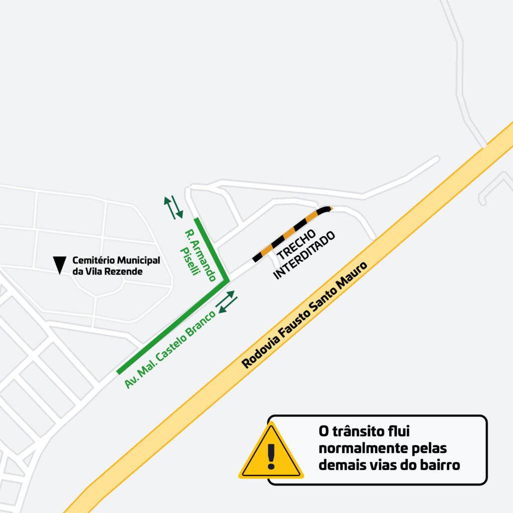 No Jardim Primavera, as equipes também vão atuar com tratamento de base, mas na avenida Marechal Castelo Branco, no trecho entre as ruas Afonso Simioni e Armando Piselli. O trecho será interditado totalmente; o trânsito circula pela rua Armando Piselli.