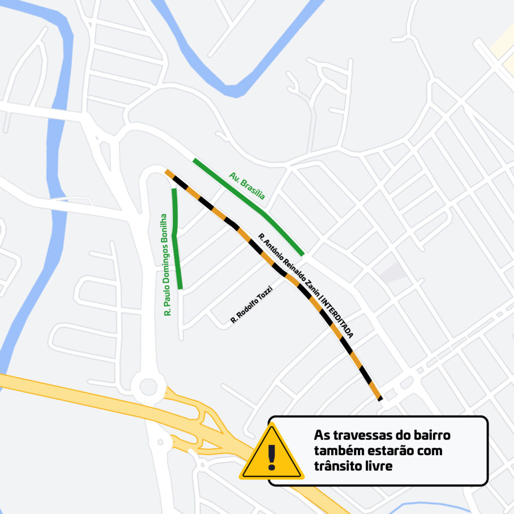 Já no bairro Vila Industrial, a rua Antonio Reinaldo Zanin passa por fresagem e pavimentação. As obras acontecem no trecho da rua José Palmieri Filho até a rua Professor Danilo Sancinetti e, por isso, será interditado totalmente. Motoristas podem utilizar a avenida Brasília e a rua Paulo Domingos Bonilha, assim como as ruas perpendiculares ao trecho, como as ruas Rodolfo Tozzi e José Zaguetti.