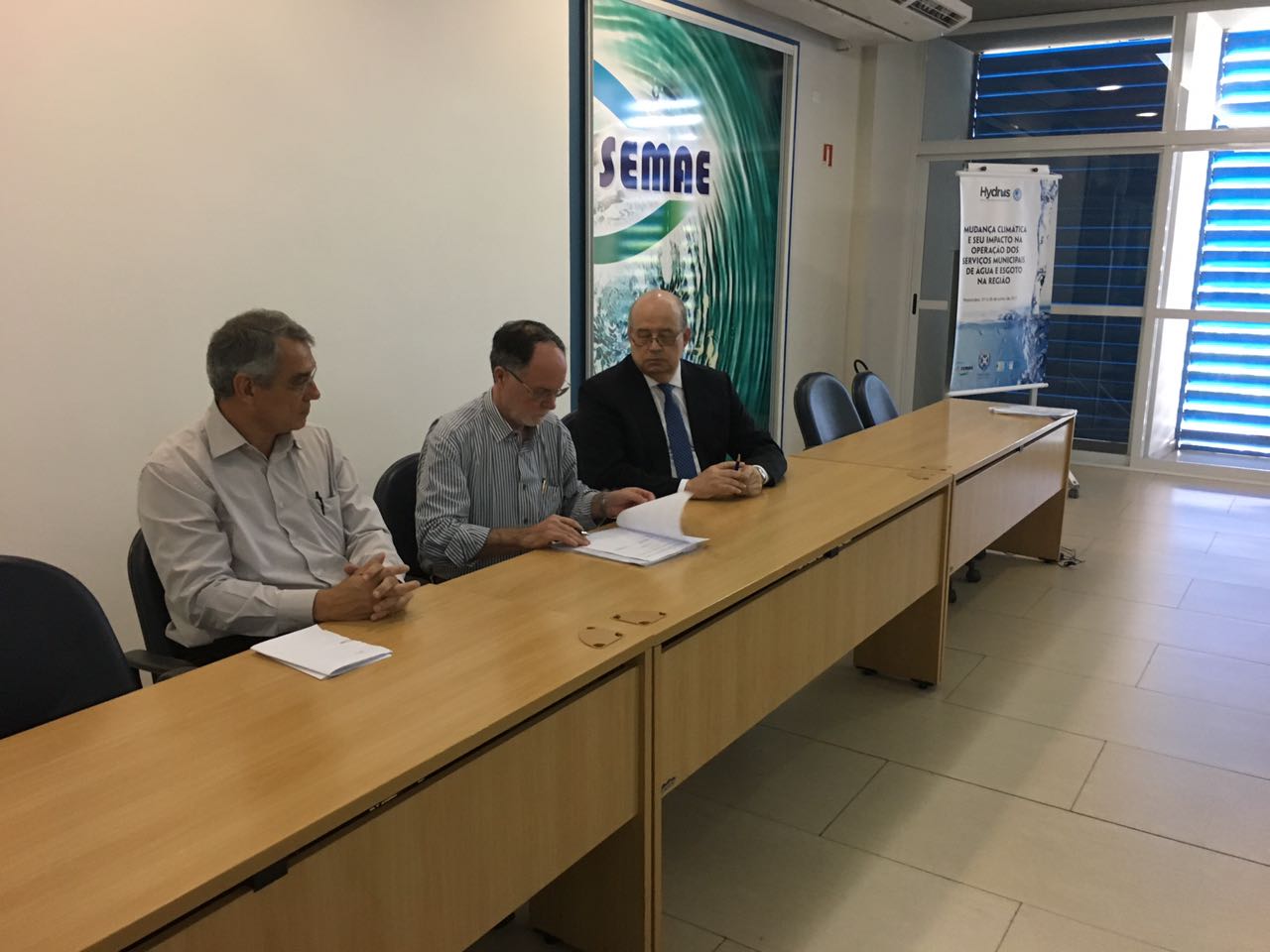 Na manhã desta quarta-feira (7) teve inicio o curso de capacitação sobre mudanças climáticas e o impacto nos serviços de água e esgoto, no auditório do Museu da Água. Na ocasião aconteceu a assinatura do protocolo de intenção para a instalação de um Centro de Formação, Qualificação e Capacitação para cursos técnicos voltados a questão do tratamento de água e esgoto. Além do presidente do Semae, o prefeito Barjas Negri e o presidente da Hydrus, Newton Lima Azevedo assinaram o protocolo.