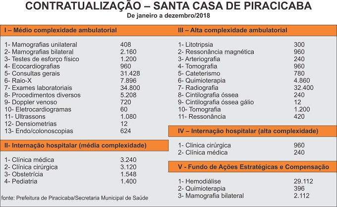 A Prefeitura de Piracicaba, por meio da Secretaria Municipal de Saúde, assinou na semana passada a nova contratualização de prestação de serviços com a Santa Casa para o ano de 2018. Em recursos, serão R$ 60,7 milhões, que correspondem a procedimentos médicos de média e alta complexidades, internações, exames e ações estratégicas.
