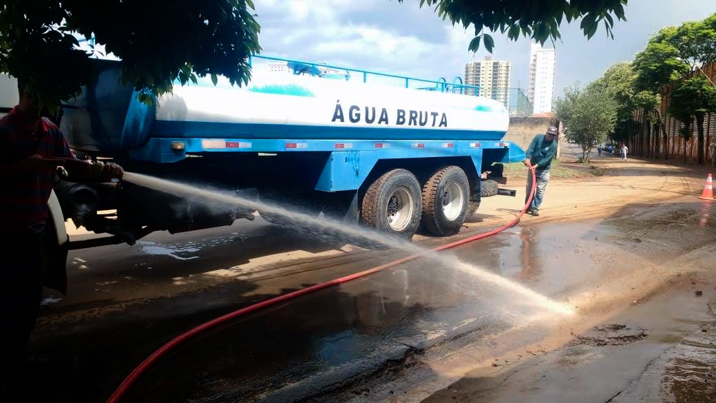 Trabalho de limpeza com caminhão-pipa na rua Dr. João Conceição, na Pauliceia
