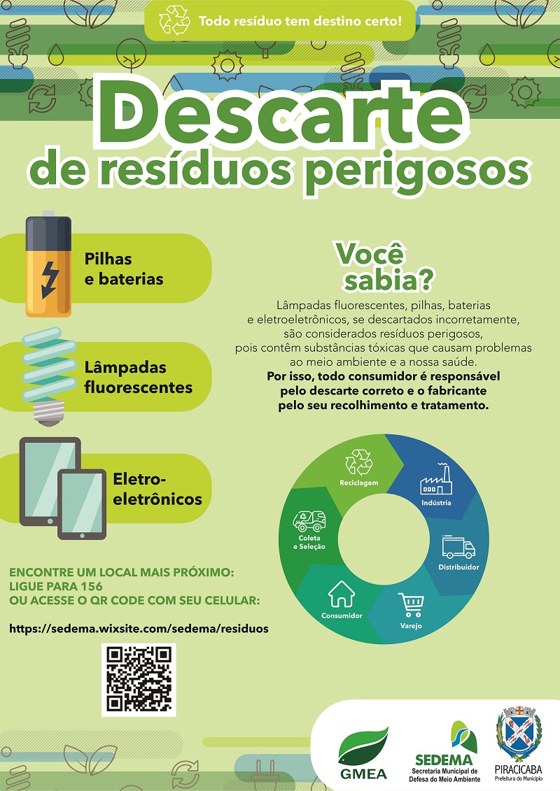 PONTOS DESATIVADOS – A partir do dia 15/03, pilhas e baterias não poderão mais ser descartadas nos Ecopontos, terminais de ônibus, Centro Cívico, Estação da Paulista, Parque do Mirante, Parque Piracicamirirm, Zoológico Municipal e Central de Resíduos da Sedema, no bairro Ondinhas. Lâmpadas fluorescentes não devem mais ser descartadas no Centro Cívico, Estação da Paulista, Parque do Mirante, Parque Piracicamirim, Zoológico Municipal e Central de Resíduos da Sedema, no bairro Ondinhas. Mais informações podem ser obtidas nos seguintes locais: Núcleo de Educação Ambiental da Sedema Telefone: 3417-9494 E-mail:neasedema@gmail.com Setor de Gerenciamento de Resíduos da Sedema Telefone: 3402-3122 E-mail:gerenciamentoderesiduos@piracicaba.sp.gov.br Serviço de Informação ao Cidadão (SIC) telefone: 156