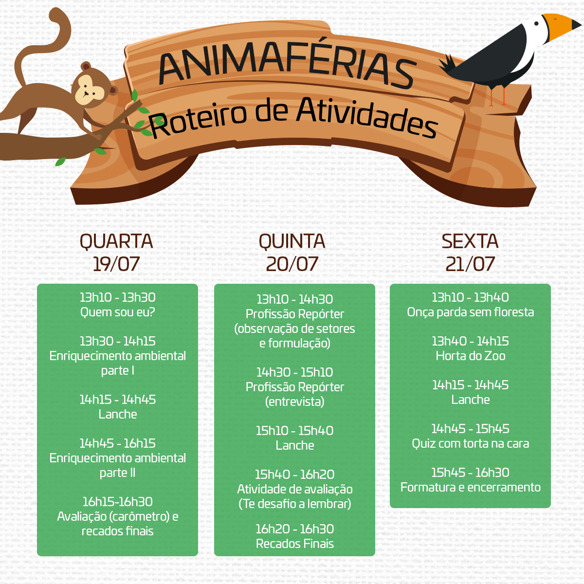 As edições do Animaférias acontecem duas vezes por ano, em janeiro e em julho, meses de férias escolares. As inscrições são limitadas a 25 participantes, que devem se inscrever previamente – o grupo participa diariamente de todas as atividades.