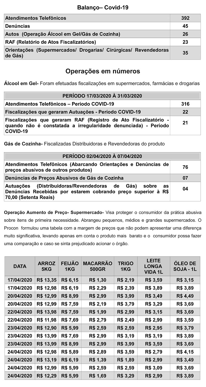 Os números são das operações que fiscalizaram o preço de gás de cozinha, álcool em gel e gêneros alimentícios de primeira necessidade. A intervenção do órgão atende reclamações da população, para impedir que os abusos de preços continuem.