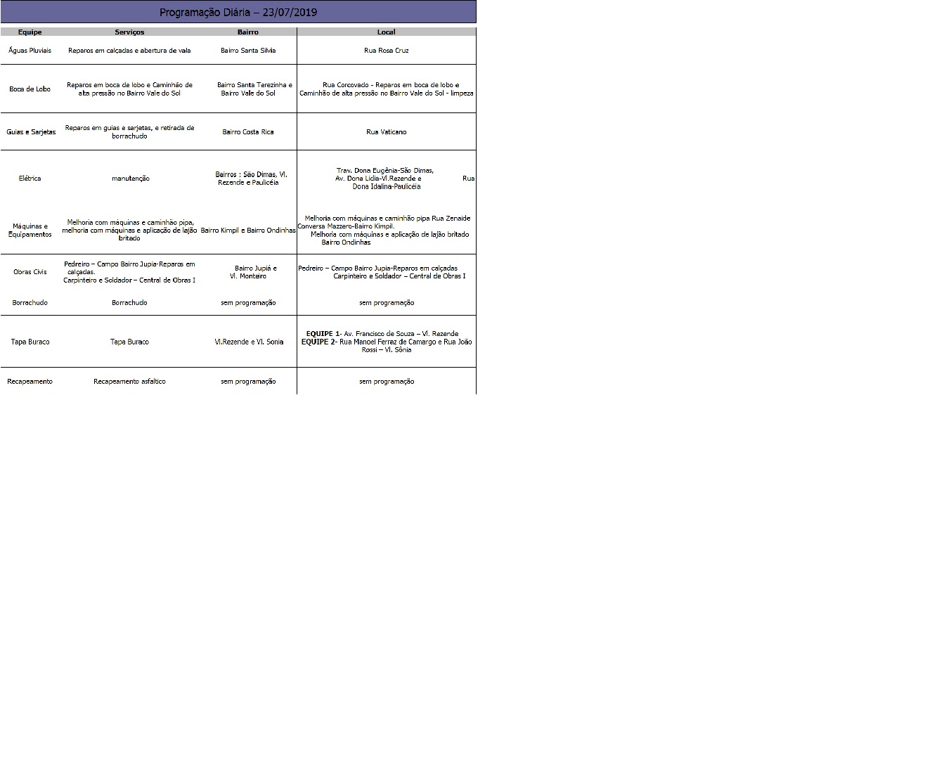 Programação da Secretaria Municipal de Obras