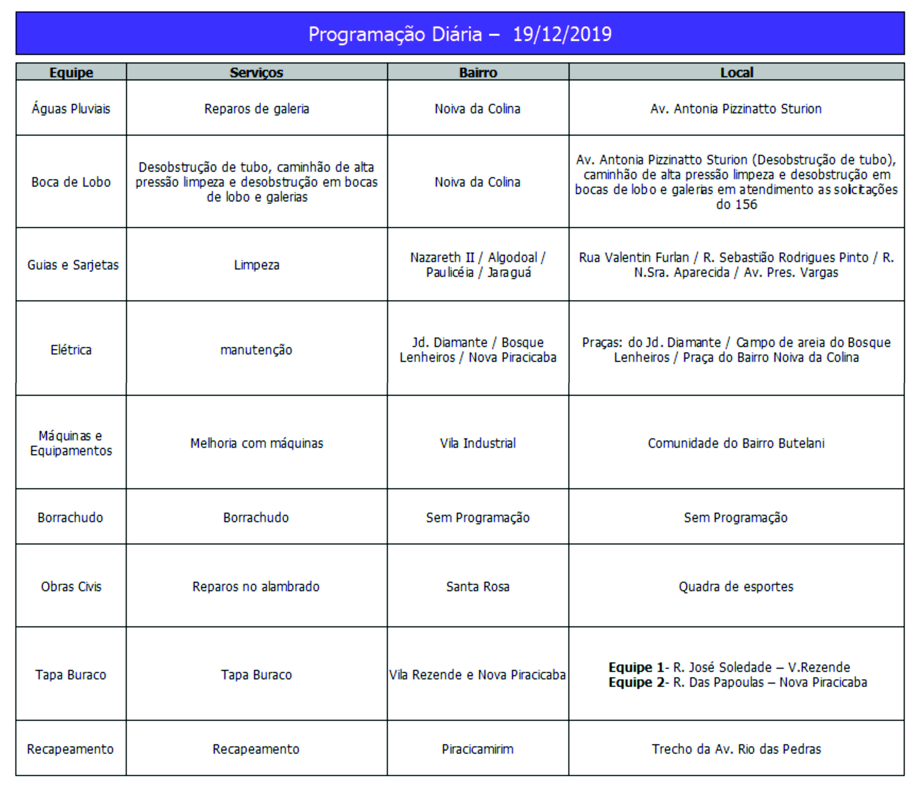 Programação da Secretaria Municipal de Obras