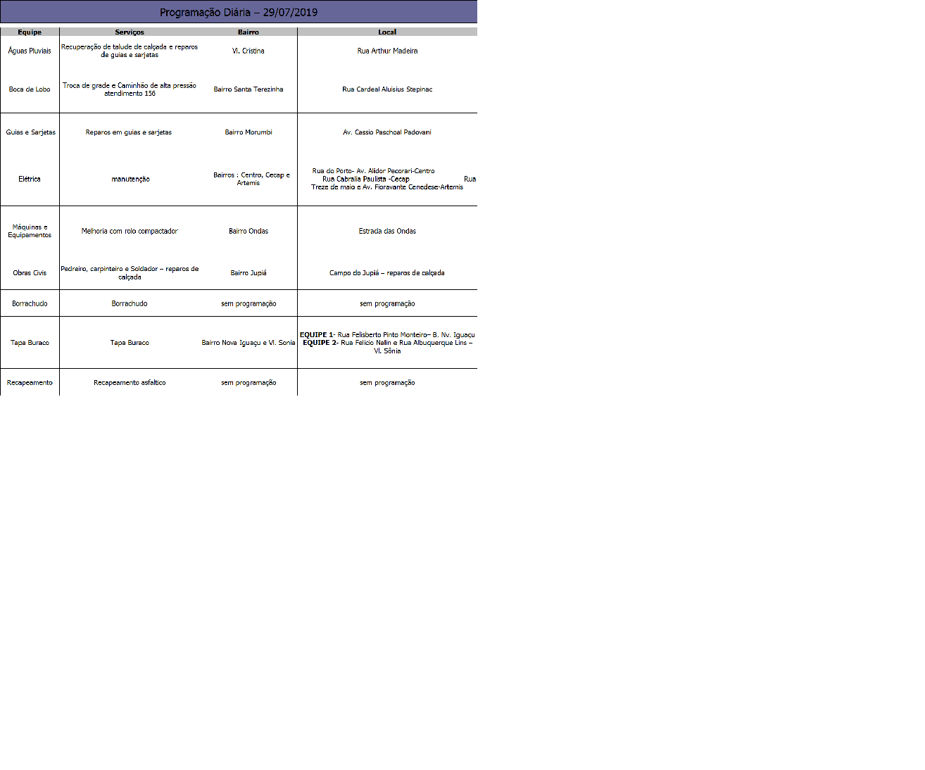 Programação da Secretaria Municipal de Obras