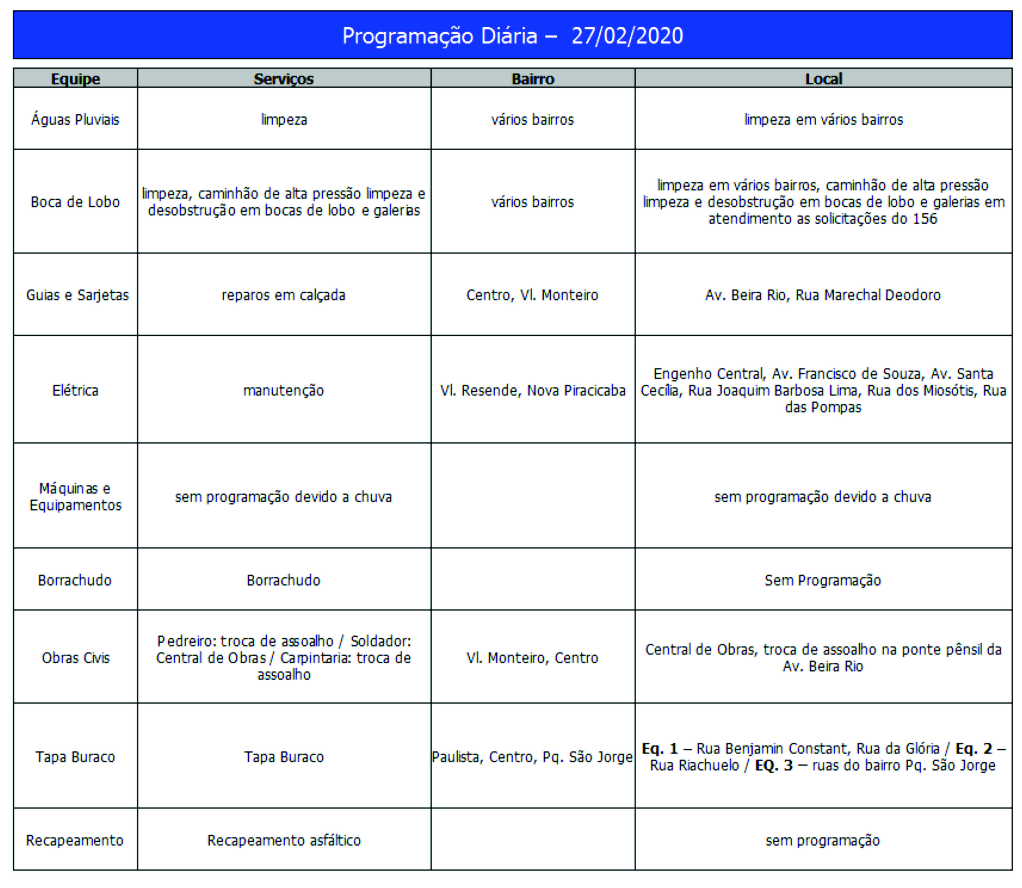 Programação da Secretaria Municipal de Obras