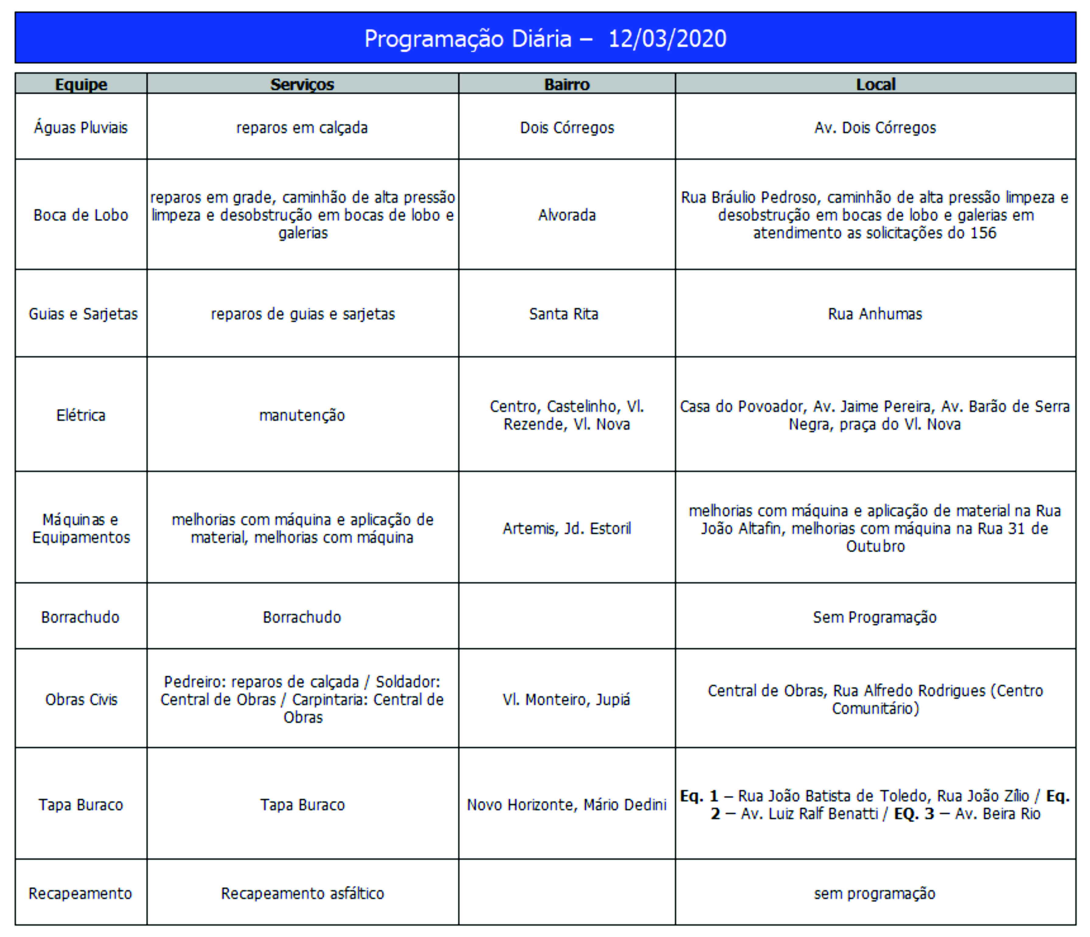 Programação da Secretaria Municipal de Obras