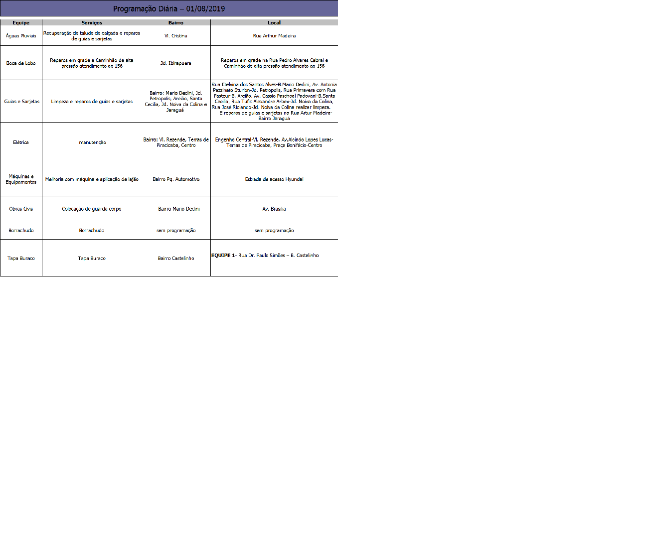 Programação da Secretaria Municipal de Obras