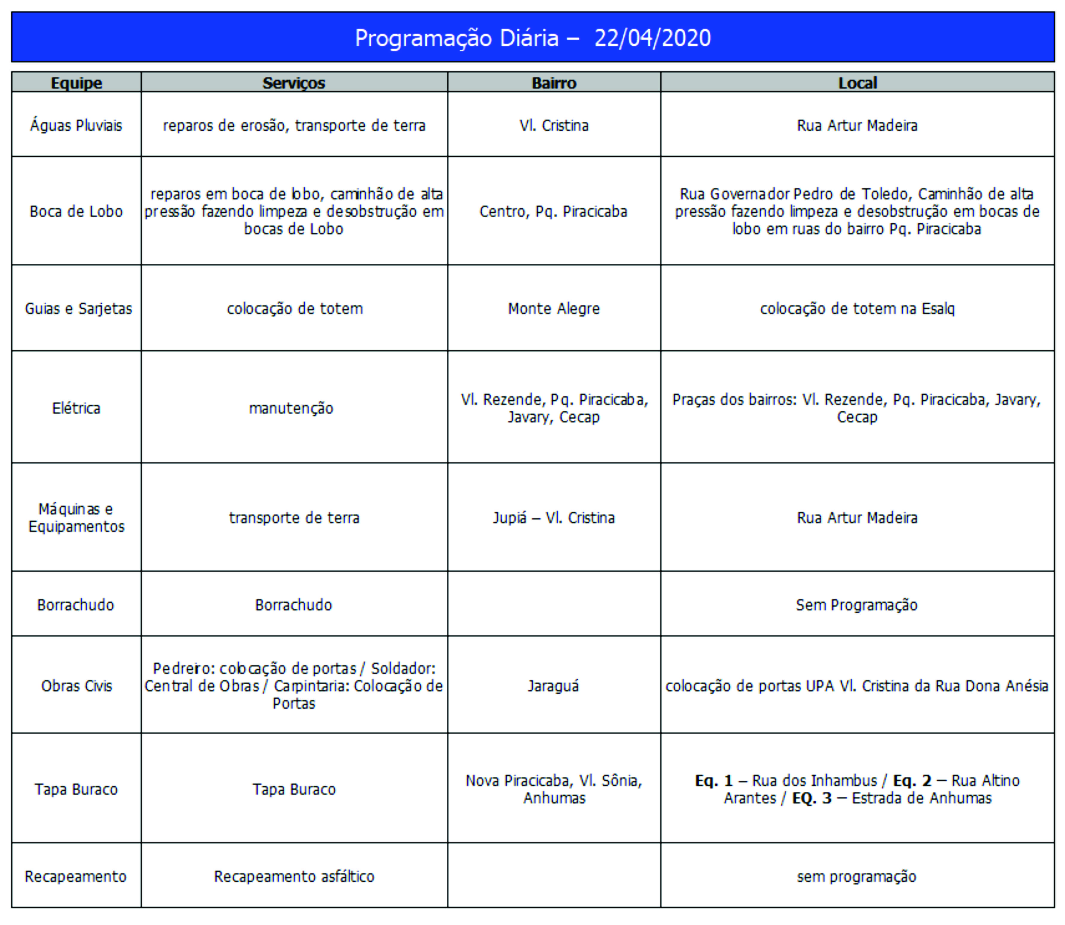 Programação da Secretaria Municipal de Obras