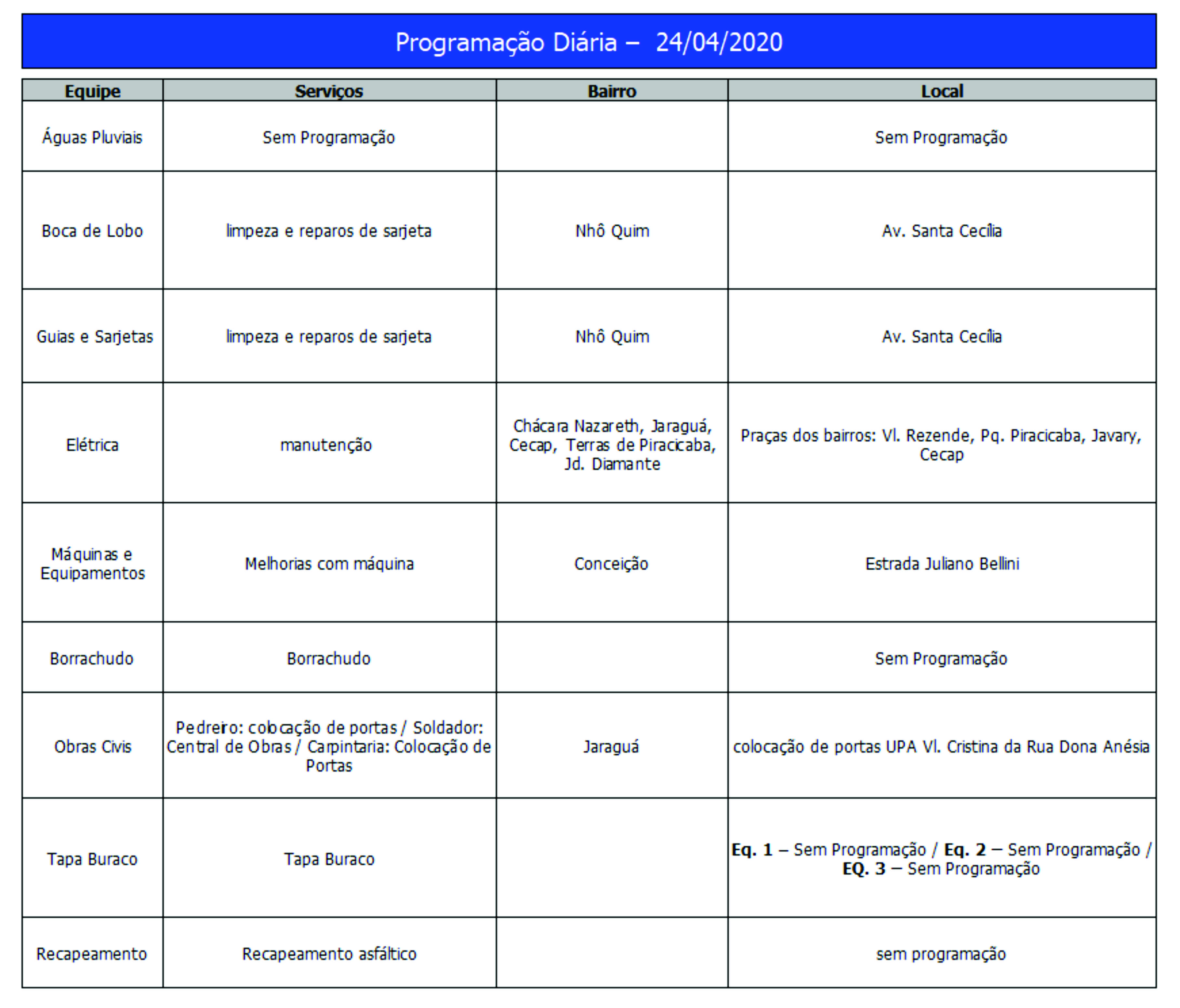 Programação da Secretaria Municipal de Obras