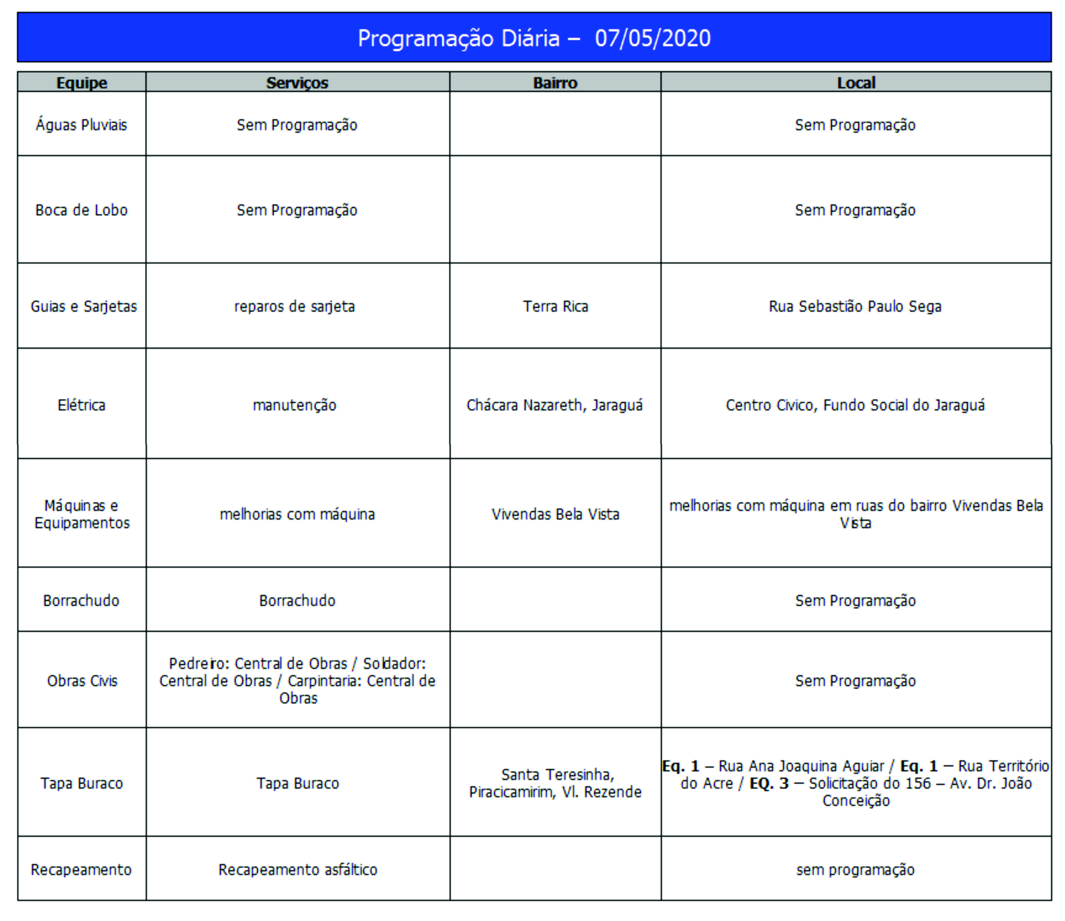 Programação da Secretaria Municipal de Obras