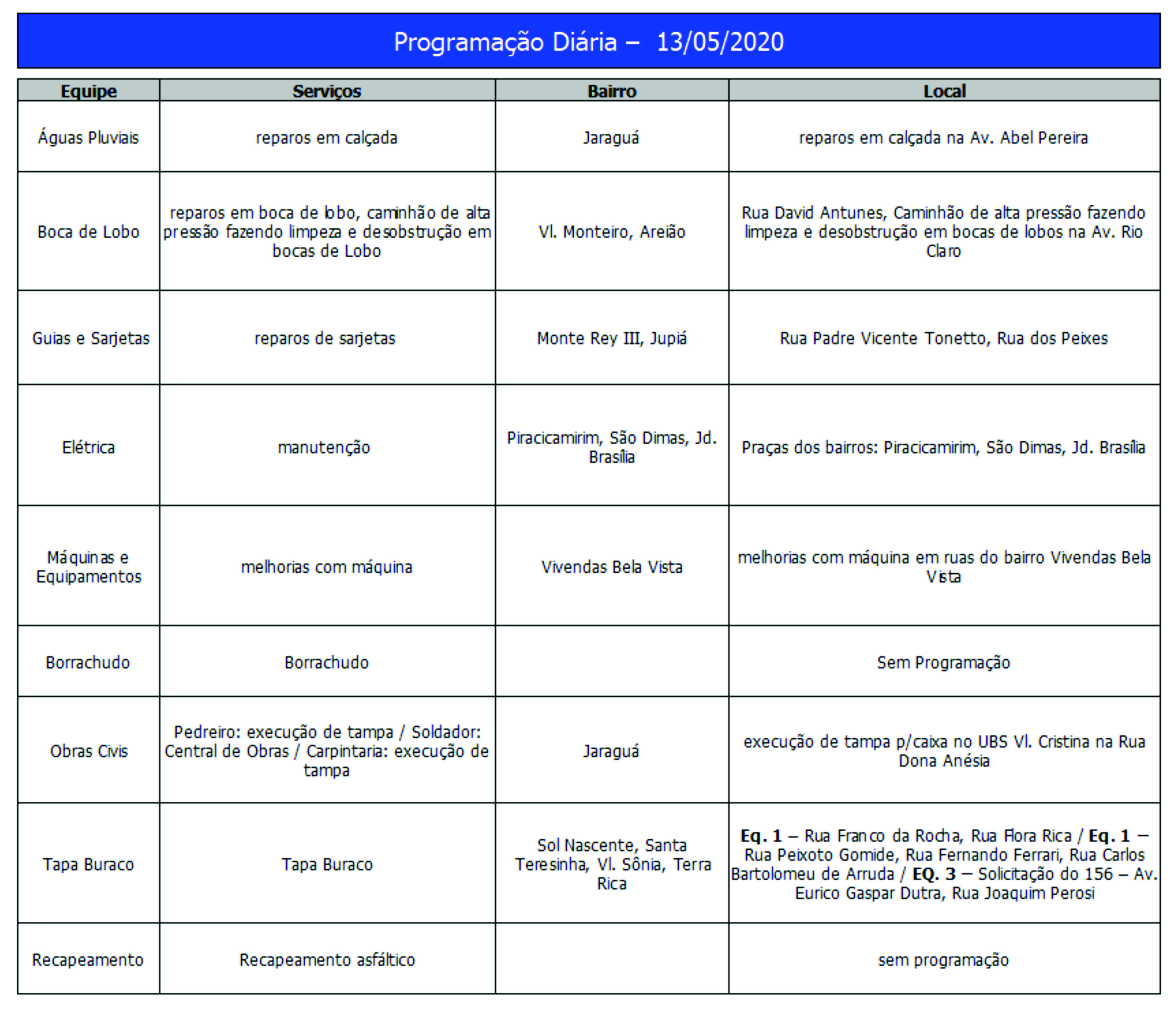 Programação da Secretaria Municipal de Obras