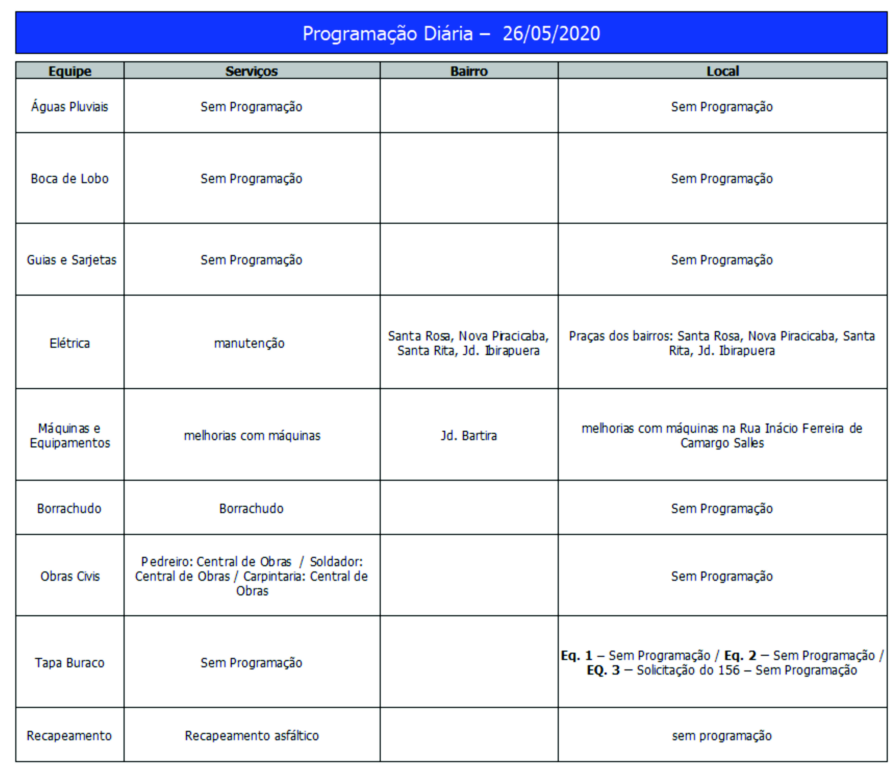 Programação da Secretaria Municipal de Obras