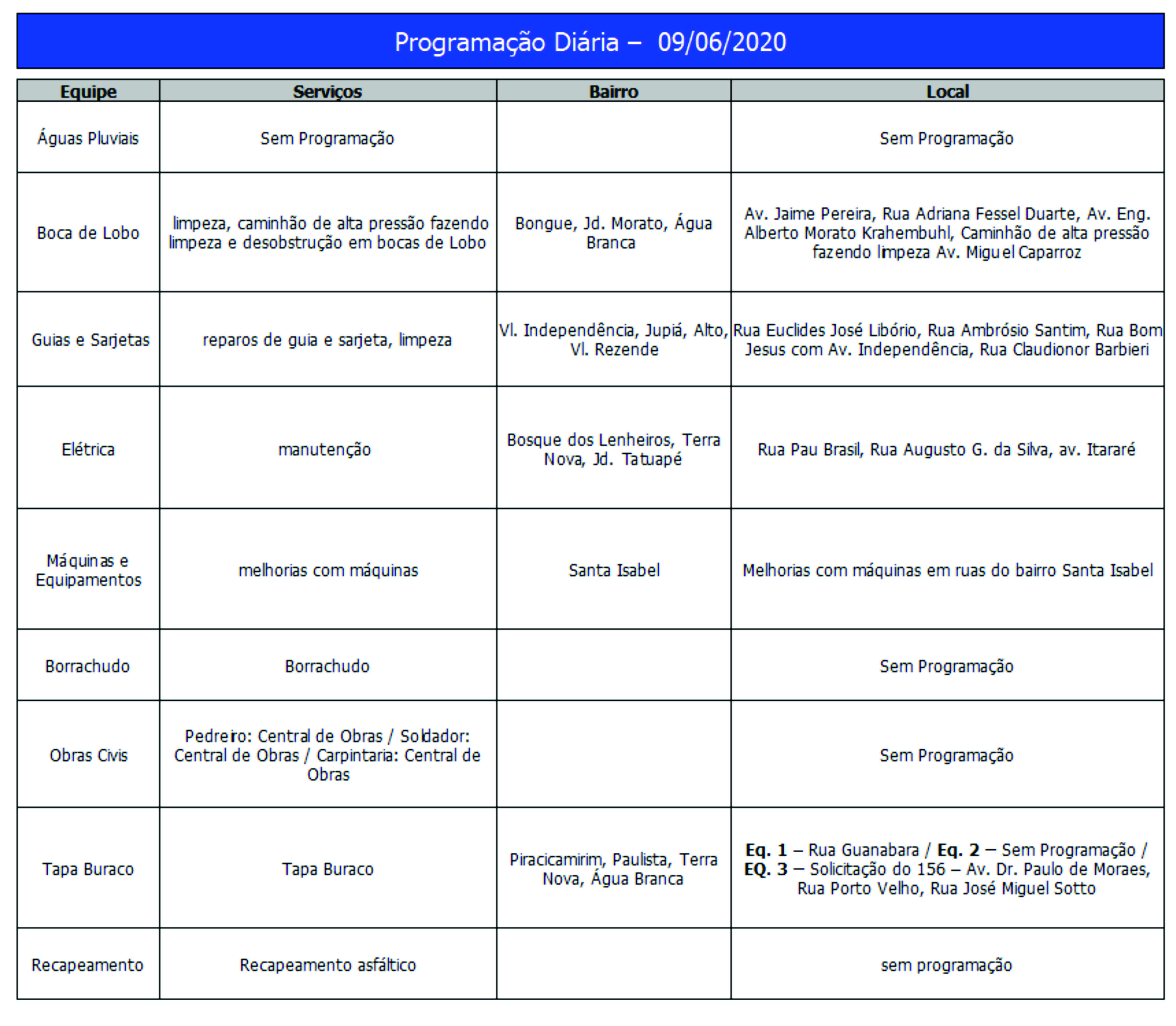 Programação da Secretaria Municipal de Obras