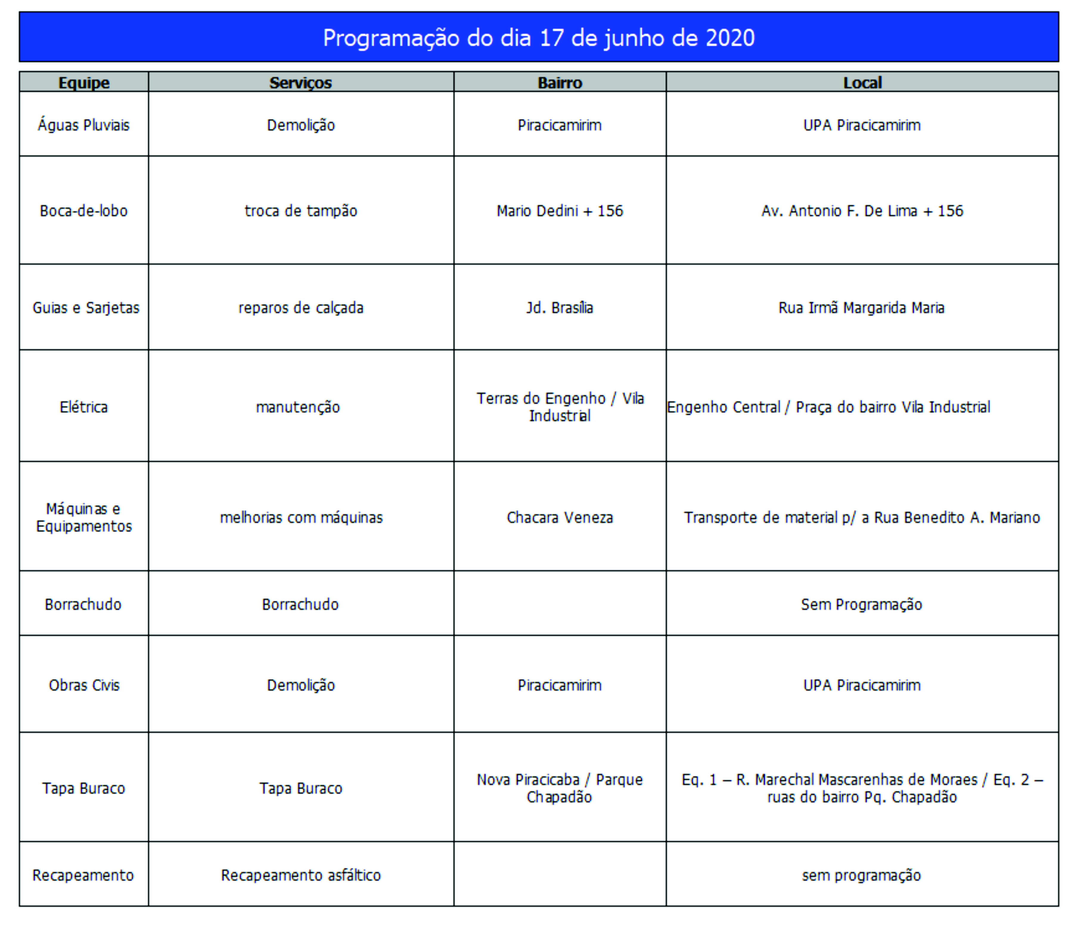 Programação da Secretaria Municipal de Obras