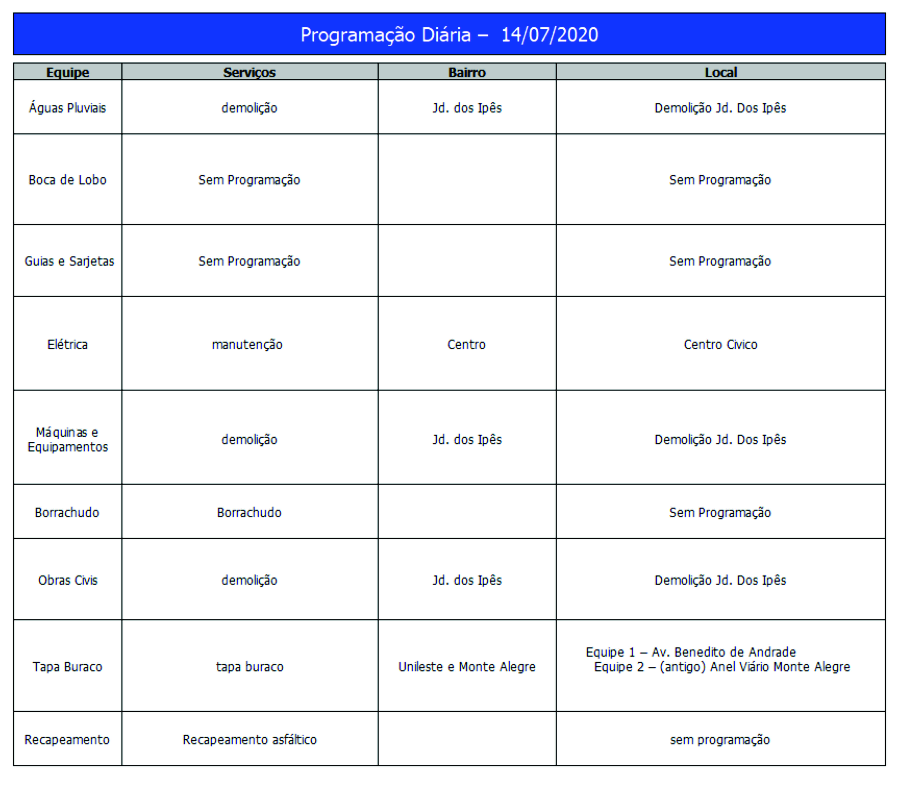Programação da Secretaria Municipal de Obras