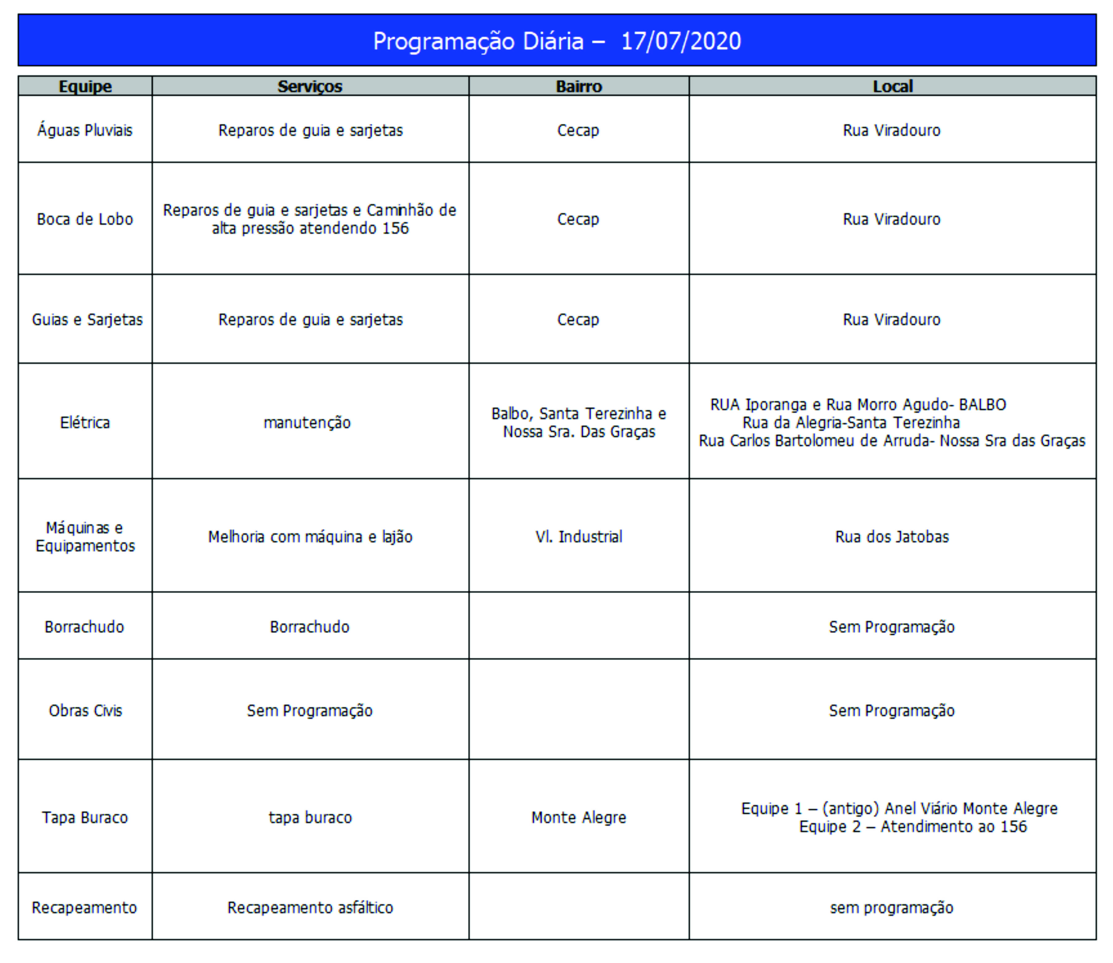 Programação da Secretaria Municipal de Obras